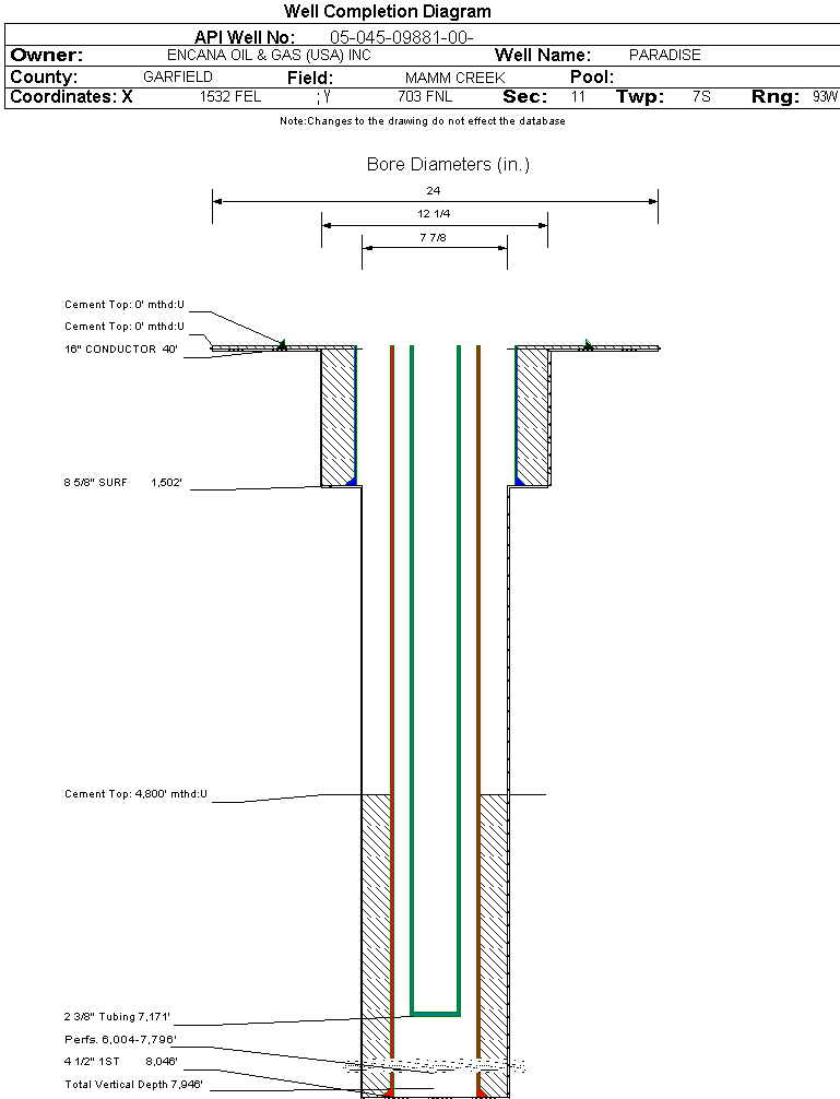 | Wellbore Completed | | Completion Date: | 1/28/2006 | | Spud Date: | 11/18/2004 | Spud Date Is: | ACTUAL | | Measured TD: | 8047 ft. | Measured PB depth: | 8001 ft. | | True Vertical TD: | 7946 ft. | True Vertical PB depth: | | | Top PZ Location: | Sec:2 Twp: 7S 93W | Footage: 48 FSL 996 FEL | | Bottom Hole Location: | Sec:2 Twp: 7S 93W | Footage: 48 FSL 996 FEL | | Log Types: | RST, CBL | | Casing: | String Type: CONDUCTOR, Hole Size: 24 in., Size: 16 in., Top: 0 ft., Depth: 40 ft., Weight: , Citings Type: ACTUAL | | Cement: | Sacks: , Top: 0 ft., Bottom: 40 ft., Determination Method: CALC | | Casing: | String Type: SURF, Hole Size: 12.25 in., Size: 8.625 in., Top: 0 ft., Depth: 1502 ft., Weight: , Citings Type: ACTUAL | | Cement: | Sacks: 1075, Top: 0 ft., Bottom: 1509 ft., Determination Method: CALC | | Casing: | String Type: 1ST, Hole Size: 7.875 in., Size: 4.5 in., Top: 0 ft., Depth: 8046 ft., Weight: , Citings Type: ACTUAL | | Cement: | Sacks: 985, Top: 4800 ft., Bottom: 8047 ft., Determination Method: CBL | | Formation | Interval Top | Log Bottom | Cored | DSTs | | WASATCH G | 0 ft. | 4725 ft. | N | N | | WILLIAMS FORK | 4726 ft. | 7948 ft. | N | N | | ROLLINS | 7949 ft. | 8047 ft. | N | N |