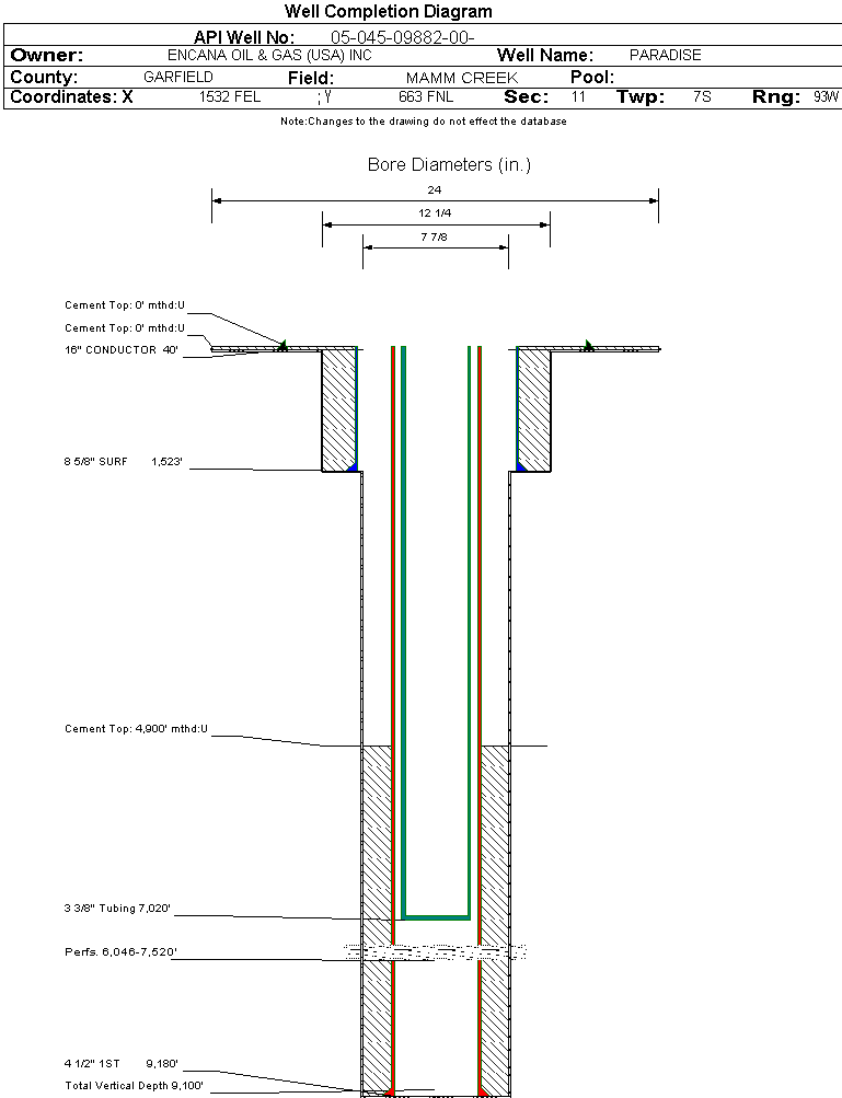 | Wellbore Completed | | Completion Date: | 3/15/2006 | | Spud Date: | 11/17/2004 | Spud Date Is: | ACTUAL | | Measured TD: | 9180 ft. | Measured PB depth: | 7768 ft. | | True Vertical TD: | 9100 ft. | True Vertical PB depth: | | | Top PZ Location: | Sec:11 Twp: 7S 93W | Footage: 53 FNL 1992 FEL | | Bottom Hole Location: | Sec:11 Twp: 7S 93W | Footage: 53 FNL 1992 FEL | | Log Types: | CBL/GR/CCL/,PEX | | Casing: | String Type: CONDUCTOR, Hole Size: 24 in., Size: 16 in., Top: 0 ft., Depth: 40 ft., Weight: , Citings Type: ACTUAL | | Cement: | Sacks: 4, Top: 0 ft., Bottom: 40 ft., Determination Method: CALC | | Casing: | String Type: SURF, Hole Size: 12.25 in., Size: 8.625 in., Top: , Depth: 1523 ft., Weight: , Citings Type: ACTUAL | | Cement: | Sacks: 1075, Top: 0 ft., Bottom: 1539 ft., Determination Method: CALC | | Casing: | String Type: 1ST, Hole Size: 7.875 in., Size: 4.5 in., Top: 0 ft., Depth: 9180 ft., Weight: , Citings Type: ACTUAL | | Cement: | Sacks: 1005, Top: 4900 ft., Bottom: 9180 ft., Determination Method: CALC | | Formation | Interval Top | Log Bottom | Cored | DSTs | | WASATCH G | | 4949 ft. | N | N | | WILLIAMS FORK | 4950 ft. | 7990 ft. | N | N | | ROLLINS | 7991 ft. | 8531 ft. | N | N | | COZZETTE | 8532 ft. | 8766 ft. | N | N | | CORCORAN | 8767 ft. | 9180 ft. | N | N |