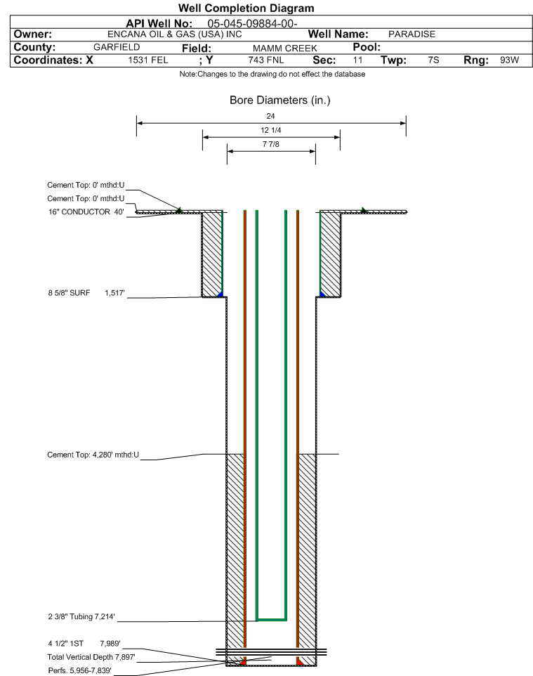 Wellbore #00 Wellbore Classification: GW Status: PR - 7/27/2006 Measured TD: 7990 ft. Vertical TD: 7897 ft.| Wellbore Data for Original Wellbore | Wellbore Classification: GW PR - 7/27/2006 | | Wellbore Permit | DIRECTIONAL | | Permit #: | | Expiration Date: | 3/3/2005 | | Proposed Top PZ Location: | Sec:11 Twp: | Footage: 1400 FNL 900 FEL | | Bottom Hole Location: | Sec:11 Twp: | Footage: 1400 FNL 900 FEL | | Proposed Depth/Form: | 8300 ft. | | Surface Mineral Owner Same: | No | | Mineral Owner: | FEE | Surface Owner: | FEE | | Unit: | | Unit Number: | | | Formation And Spacing: | Code: CZ-CR , Formation: COZZETTE-CORCORAN , Order: , Unit Acreage: , Drill Unit: | | Formation And Spacing: | Code: RLNS , Formation: ROLLINS , Order: , Unit Acreage: , Drill Unit: | | Formation And Spacing: | Code: WMFK , Formation: WILLIAMS FORK , Order: , Unit Acreage: , Drill Unit: | | Casing: | String Type: CONDUCTOR, Hole Size: 30 in., Size: 20 in., Top: 0 ft., Depth: 100 ft., Weight: 52.8# , Citings Type: PLANNED | | Cement: | Sacks: 211, Top: 0 ft., Bottom: 100 ft. | | Casing: | String Type: SURF, Hole Size: 14.75 in., Size: 9.625 in., Top: 0 ft., Depth: 2500 ft., Weight: 36# , Citings Type: PLANNED | | Cement: | Sacks: 623, Top: 0 ft., Bottom: 2500 ft. | | Casing: | String Type: 1ST, Hole Size: 8.75 in., Size: 4.5 in., Top: 0 ft., Depth: 10218 ft., Weight: 11.6# , Citings Type: PLANNED | | Cement: | Sacks: 936, Top: 5704 ft., Bottom: 10218 ft. |