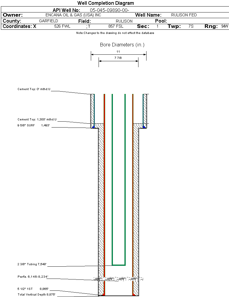 | Wellbore Completed | | Completion Date: | N/A | | Spud Date: | 4/13/2004 | Spud Date Is: | ACTUAL | | Measured TD: | 8875 ft. | Measured PB depth: | | | True Vertical TD: | | True Vertical PB depth: | | | Top PZ Location: | Sec:1 Twp: 94W SESW | Footage: 400 FSL 1600 FWL | | Bottom Hole Location: | Sec:1 Twp: 7S 94W | Footage: 400 FSL 1600 FWL | | Log Types: | RESERVOIR SATURATION TOOL/GR/CCL, CBL/GR/CCL/TEMPERATURE LOG | | Casing: | String Type: SURF, Hole Size: 11 in., Size: 9.625 in., Top: 0 ft., Depth: 1493 ft., Weight: 36 , Citings Type: ACTUAL | | Cement: | Sacks: 575, Top: 0 ft., Bottom: 1493 ft., Determination Method: CALC | | Casing: | String Type: 1ST, Hole Size: 7.875 in., Size: 5.5 in., Top: 0 ft., Depth: 8865 ft., Weight: 17 , Citings Type: ACTUAL | | Cement: | Sacks: 1370, Top: 1300 ft., Bottom: 8875 ft., Determination Method: CBL | | Formation | Interval Top | Log Bottom | Cored | DSTs | | WASATCH | 0 ft. | | N | N | | WILLIAMS FORK | 5454 ft. | | N | N |