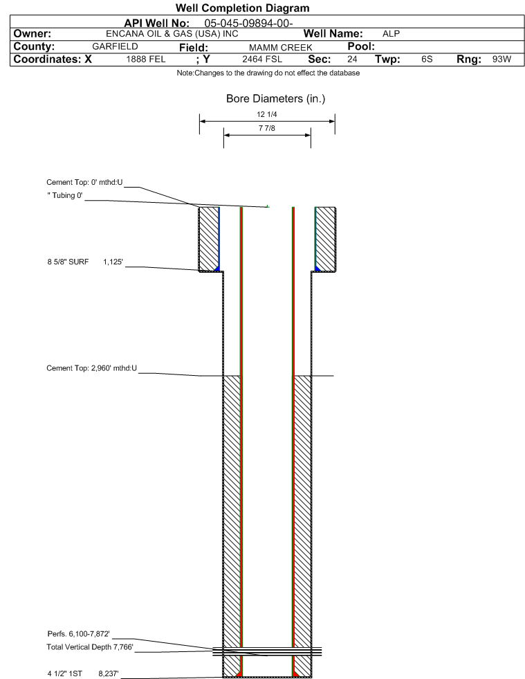 | | Perforation Data: | | Interval Top: | 6100 ft. | # Of Holes: | 102 | | Interval Bottom: | 7872 ft. | Hole Size: | 0.34 in. |