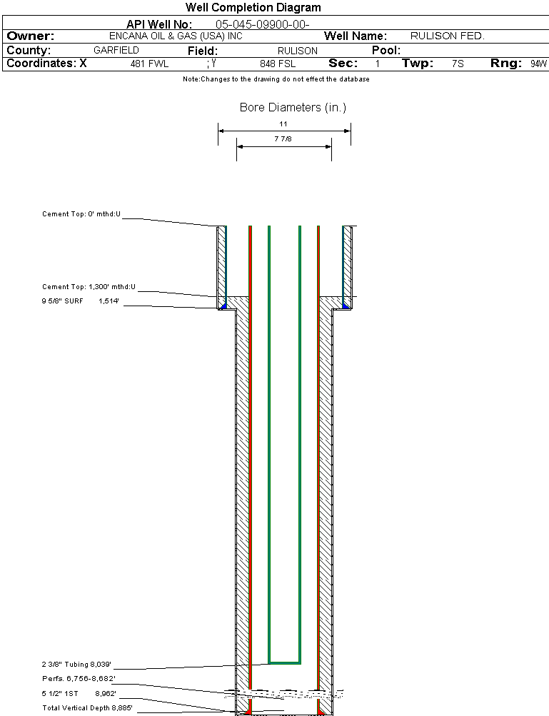 | Wellbore Completed | | Completion Date: | 12/8/2004 | | Spud Date: | 5/25/2004 | Spud Date Is: | ACTUAL | | Measured TD: | 8970 ft. | Measured PB depth: | 8883 ft. | | True Vertical TD: | 8885 ft. | True Vertical PB depth: | | | Top PZ Location: | Sec:1 Twp: 7S 94W | Footage: 1800 FSL 500 FWL | | Bottom Hole Location: | Sec:1 Twp: 7S 94W | Footage: 1800 FSL 500 FWL | | Log Types: | RESERVOIR SATURATION TOOL/GR/CCL, CBL/GR/CCL/TEMPERATURE LOG | | Log Types: | CBL/GR/CCL, RTS/GR/CCL | | Casing: | String Type: SURF, Hole Size: 11 in., Size: 9.625 in., Top: 0 ft., Depth: 1514 ft., Weight: 36 , Citings Type: ACTUAL | | Cement: | Sacks: 500, Top: 0 ft., Bottom: 1514 ft., Determination Method: CALC | | Casing: | String Type: 1ST, Hole Size: 7.875 in., Size: 5.5 in., Top: 0 ft., Depth: 8962 ft., Weight: 17 , Citings Type: ACTUAL | | Cement: | Sacks: 600, Top: 1300 ft., Bottom: 8970 ft., Determination Method: CBL | | Casing: | String Type: S.C. 2.1, Hole Size: , Size: , Top: , Depth: 6593 ft., Weight: , Citings Type: ACTUAL | | Cement: | Sacks: 50, Top: , Bottom: , Determination Method: | | Formation | Interval Top | Log Bottom | Cored | DSTs | | WASATCH | 2450 ft. | | N | N | | WILLIAMS FORK | 5972 ft. | | N | N |