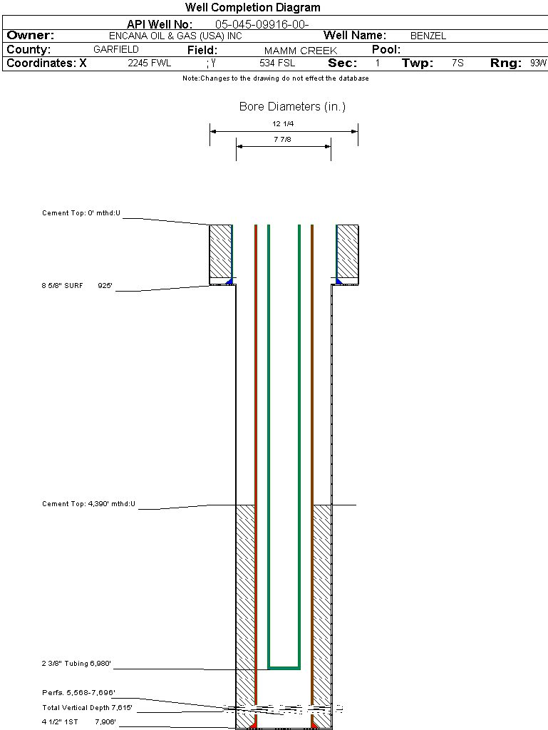 | Wellbore Completed | | Completion Date: | 7/23/2004 | | Spud Date: | 3/26/2004 | Spud Date Is: | ACTUAL | | Measured TD: | 7920 ft. | Measured PB depth: | 7858 ft. | | True Vertical TD: | 7615 ft. | True Vertical PB depth: | | | Top PZ Location: | Sec:1 Twp: | Footage: 1990 FSL 2630 FWL | | Bottom Hole Location: | Sec:1 Twp: | Footage: 1990 FSL 2630 FWL | | Log Types: | CBL / GR, RES / SAT | | Casing: | String Type: SURF, Hole Size: 12.25 in., Size: 8.625 in., Top: 0 ft., Depth: 925 ft., Weight: 32 , Citings Type: ACTUAL | | Cement: | Sacks: 475, Top: 0 ft., Bottom: 825 ft., Determination Method: CBL | | Casing: | String Type: 1ST, Hole Size: 7.875 in., Size: 4.5 in., Top: 0 ft., Depth: 7906 ft., Weight: 11.6 , Citings Type: ACTUAL | | Cement: | Sacks: 967, Top: 4390 ft., Bottom: 7906 ft., Determination Method: CALC | | Formation | Interval Top | Log Bottom | Cored | DSTs | | WASATCH | 0 ft. | 4677 ft. | N | N | | WILLIAMS FORK | 4678 ft. | 7920 ft. | N | N |