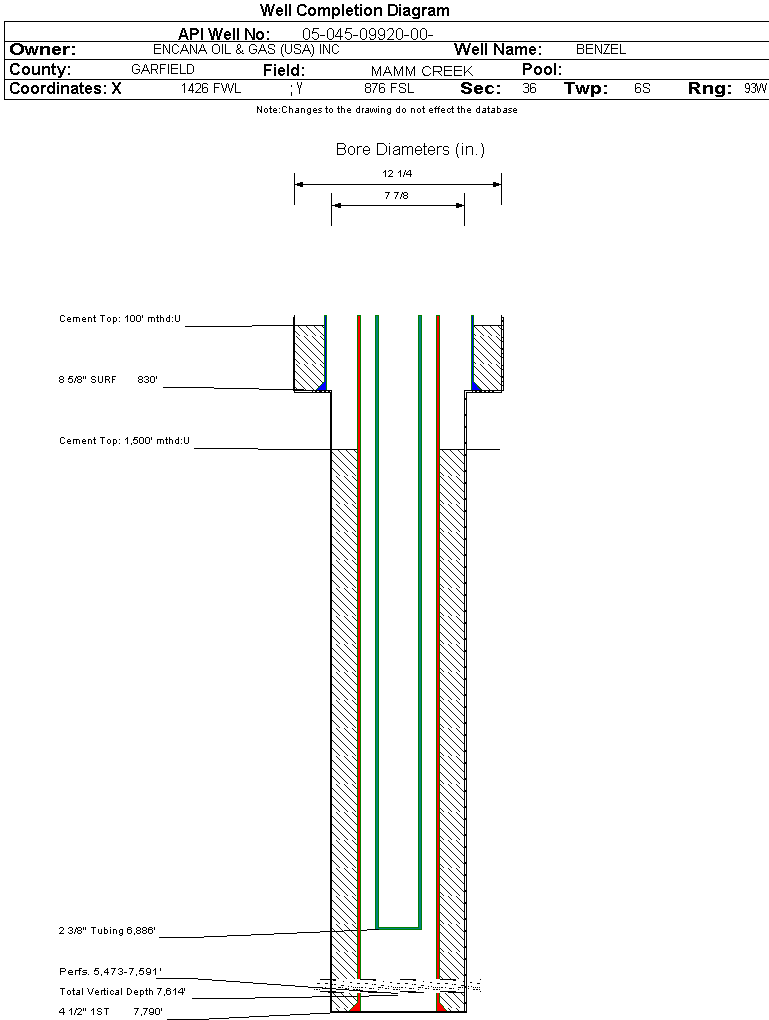 | Wellbore Completed | | Completion Date: | 8/22/2004 | | Spud Date: | 4/8/2004 | Spud Date Is: | ACTUAL | | Measured TD: | 7800 ft. | Measured PB depth: | 7730 ft. | | True Vertical TD: | 7614 ft. | True Vertical PB depth: | 7544 ft. | | Top PZ Location: | Sec:1 Twp: 7S 93W | Footage: 357 FNL 1310 FWL | | Bottom Hole Location: | Sec:1 Twp: 7S 96W | Footage: 357 FNL 1310 FWL | | Log Types: | PEX-AITH, GR-CBL/TEMP | | Casing: | String Type: SURF, Hole Size: 12.25 in., Size: 8.625 in., Top: 0 ft., Depth: 830 ft., Weight: 24 , Citings Type: ACTUAL | | Cement: | Sacks: 450, Top: 100 ft., Bottom: 830 ft., Determination Method: CBL | | Casing: | String Type: 1ST, Hole Size: 7.875 in., Size: 4.5 in., Top: 0 ft., Depth: 7790 ft., Weight: 11.6 , Citings Type: ACTUAL | | Cement: | Sacks: 1275, Top: 1500 ft., Bottom: 7790 ft., Determination Method: CALC | | Formation | Interval Top | Log Bottom | Cored | DSTs | | WASATCH | 0 ft. | 4545 ft. | N | N | | WILLIAMS FORK | 4546 ft. | 7666 ft. | N | N | | ROLLINS | 7667 ft. | 7800 ft. | N | N |