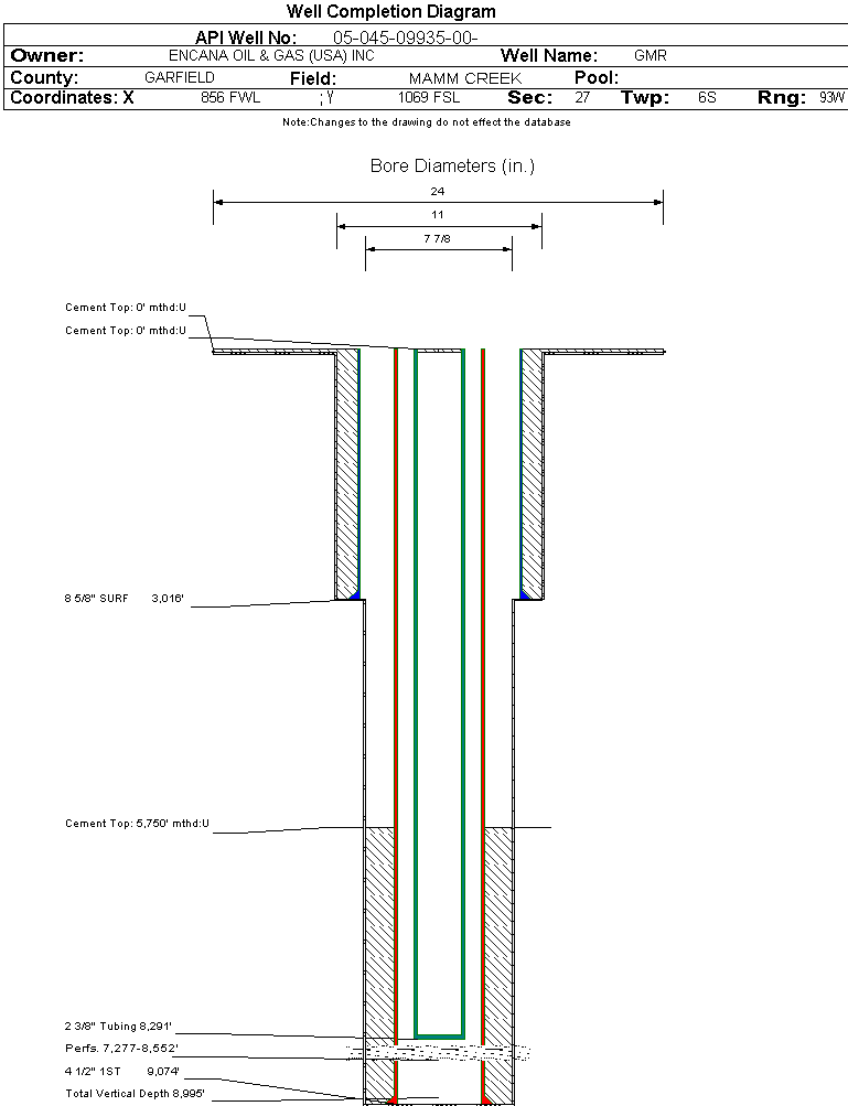 | Wellbore Completed | | Completion Date: | 11/20/2004 | | Spud Date: | 7/20/2004 | Spud Date Is: | ACTUAL | | Measured TD: | 9080 ft. | Measured PB depth: | 8998 ft. | | True Vertical TD: | 8995 ft. | True Vertical PB depth: | | | Top PZ Location: | Sec:28 Twp: | Footage: 1320 FSL 10 FEL | | Bottom Hole Location: | Sec:28 Twp: | Footage: 1320 FSL 10 FEL | | Log Types: | CBL / GR / TEMP, PEX | | Casing: | String Type: CONDUCTOR, Hole Size: 24 in., Size: 16 in., Top: 0 ft., Depth: 40 ft., Weight: 42 , Citings Type: ACTUAL | | Cement: | Sacks: 5, Top: 0 ft., Bottom: 40 ft., Determination Method: CALC | | Casing: | String Type: SURF, Hole Size: 11 in., Size: 8.625 in., Top: 0 ft., Depth: 3016 ft., Weight: 24 , Citings Type: ACTUAL | | Cement: | Sacks: 955, Top: 0 ft., Bottom: 3025 ft., Determination Method: CALC | | Casing: | String Type: 1ST, Hole Size: 7.875 in., Size: 4.5 in., Top: 0 ft., Depth: 9074 ft., Weight: 11.6 , Citings Type: ACTUAL | | Cement: | Sacks: 835, Top: 5750 ft., Bottom: 9080 ft., Determination Method: CBL | | Formation | Interval Top | Log Bottom | Cored | DSTs | | WASATCH | 0 ft. | 5937 ft. | N | N | | WILLIAMS FORK | 5938 ft. | 9080 ft. | N | N |