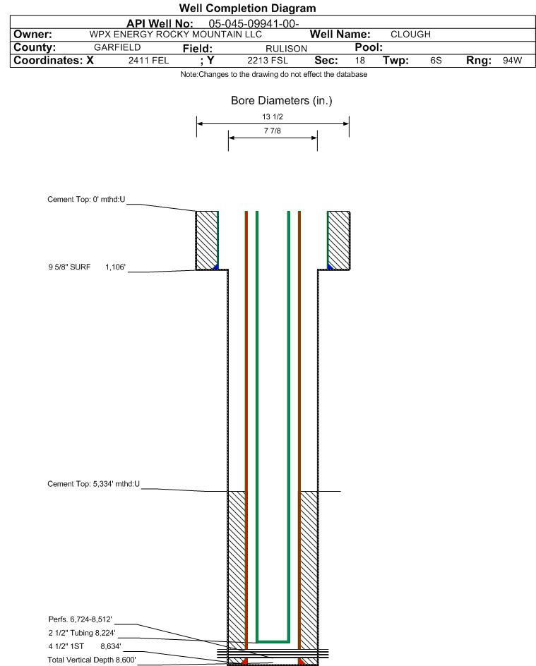 | | Tubing Size: | 2.6 in. | Tubing Setting Depth: | 8224 ft. | | Tubing Packer Depth: | | Tubing Multiple Packer: | | | Open Hole Top: | | Open Hole Bottom: | | | Initial Test Data: | | Test Date: | N/A | Test Method: | | | Hours Tested: | | Gas Type: | | | Gas Disposal: | | |