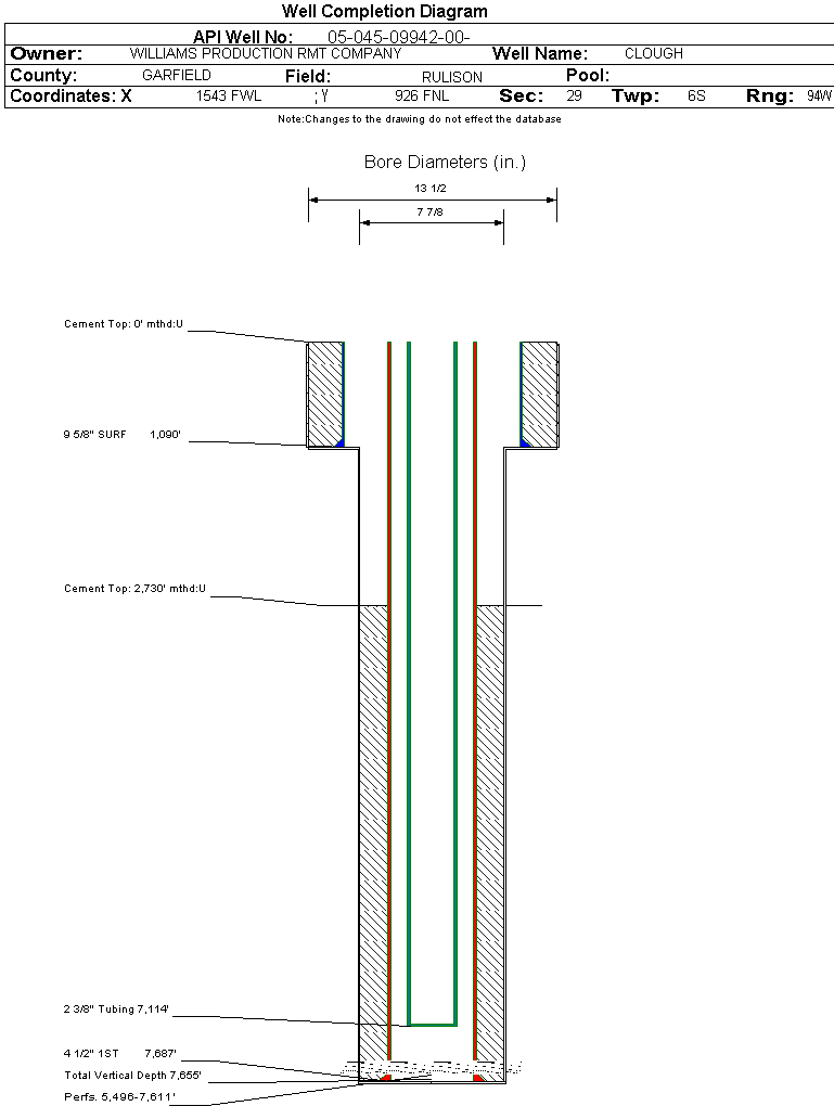 Wellbore #00 Wellbore Classification: GW Status: PR - 6/23/2004 Measured TD: 7690 ft. Vertical TD: 7655 ft.| Wellbore Data for Original Wellbore | Wellbore Classification: GW PR - 6/23/2004 | | Wellbore Permit | DIRECTIONAL | | Permit #: | 20040525 | Expiration Date: | 3/25/2005 | | Proposed Top PZ Location: | Sec: Twp: | Footage: 802 FNL 2015 FWL | | Bottom Hole Location: | Sec: Twp: | Footage: 802 FNL 2015 FWL | | Proposed Depth/Form: | 7660 ft. | | Surface Mineral Owner Same: | Not available | | Mineral Owner: | FEE | Surface Owner: | FEE | | Unit: | | Unit Number: | | | Formation And Spacing: | Code: WMFK , Formation: WILLIAMS FORK , Order: 139-38 , Unit Acreage: 320, Drill Unit: N/2 |