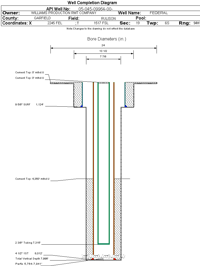 Wellbore #00 Wellbore Classification: OW Status: PR - 9/9/2004 Measured TD: 8017 ft. Vertical TD: 7996 ft.| Wellbore Data for Original Wellbore | Wellbore Classification: OW PR - 9/9/2004 | | Wellbore Permit | DIRECTIONAL | | Permit #: | 20040603 | Expiration Date: | 4/5/2005 | | Proposed Top PZ Location: | Sec: Twp: | Footage: 1640 FSL 2437 FEL | | Bottom Hole Location: | Sec: Twp: | Footage: 1640 FSL 2437 FEL | | Proposed Depth/Form: | 8140 ft. | | Surface Mineral Owner Same: | Yes | | Mineral Owner: | FEDERAL | Surface Owner: | FEDERAL | | Unit: | | Unit Number: | | | Formation And Spacing: | Code: WMFK , Formation: WILLIAMS FORK , Order: 139-40 , Unit Acreage: 320, Drill Unit: S/2 |