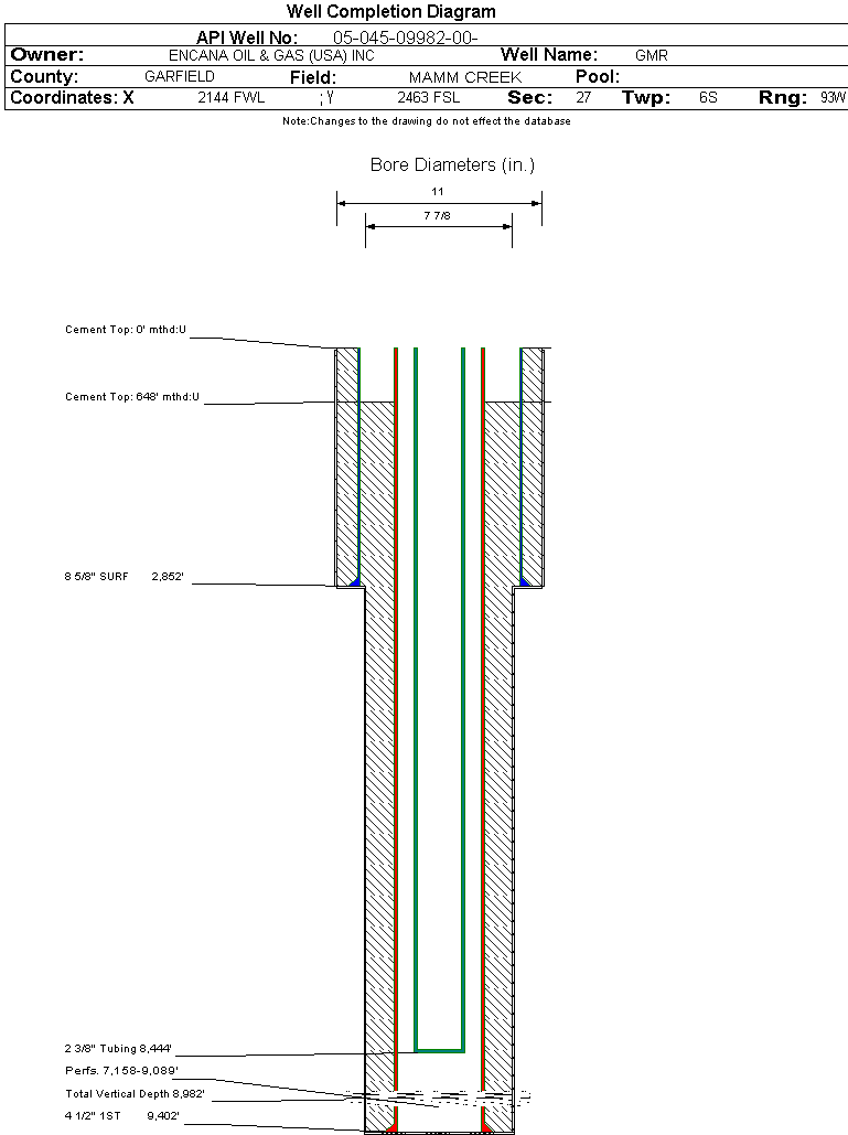 | Wellbore Completed | | Completion Date: | 11/12/2004 | | Spud Date: | 6/12/2004 | Spud Date Is: | ACTUAL | | Measured TD: | 9402 ft. | Measured PB depth: | 9332 ft. | | True Vertical TD: | 8982 ft. | True Vertical PB depth: | 0 ft. | | Top PZ Location: | Sec:27 Twp: | Footage: 666 FNL 2630 FWL | | Bottom Hole Location: | Sec:27 Twp: | Footage: 650 FNL 2630 FWL | | Log Types: | | | Casing: | String Type: SURF, Hole Size: 11 in., Size: 8.625 in., Top: 0 ft., Depth: 2852 ft., Weight: 24 , Citings Type: ACTUAL | | Cement: | Sacks: 710, Top: 0 ft., Bottom: 2852 ft., Determination Method: CALC | | Casing: | String Type: 1ST, Hole Size: 7.875 in., Size: 4.5 in., Top: 0 ft., Depth: 9402 ft., Weight: 11.6 , Citings Type: ACTUAL | | Cement: | Sacks: 1280, Top: 648 ft., Bottom: 9402 ft., Determination Method: CBL | | Formation | Interval Top | Log Bottom | Cored | DSTs | | WASATCH | 0 ft. | 6153 ft. | N | N | | WILLIAMS FORK | 6154 ft. | 9402 ft. | N | N |
