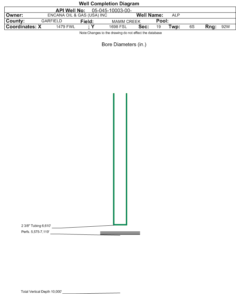 Wellbore #00 Wellbore Classification: GW Status: PR - 1/7/2008 Measured TD: | Wellbore Data for Original Wellbore | Wellbore Classification: GW PR - 1/7/2008 | | Wellbore Permit | DIRECTIONAL | | Permit #: | 20040739 | Expiration Date: | 4/22/2005 | | Proposed Top PZ Location: | Sec: Twp: | Footage: 660 FSL 1980 FEL | | Bottom Hole Location: | Sec:19 Twp: | Footage: 660 FSL 1980 FEL | | Proposed Depth/Form: | 7900 ft. | | Surface Mineral Owner Same: | No | | Mineral Owner: | FEE | Surface Owner: | FEE | | Unit: | | Unit Number: | | | Formation And Spacing: | Code: CZ-CR , Formation: COZZETTE-CORCORAN , Order: 318 , Unit Acreage: , Drill Unit: | | Formation And Spacing: | Code: RLNS , Formation: ROLLINS , Order: 318 , Unit Acreage: , Drill Unit: | | Formation And Spacing: | Code: WMFK , Formation: WILLIAMS FORK , Order: 318 , Unit Acreage: , Drill Unit: | | Casing: | String Type: SURF, Hole Size: 12.25 in., Size: 8.625 in., Top: , Depth: 790 ft., Weight: 24 , Citings Type: PLANNED | | Cement: | Sacks: 543, Top: 0 ft., Bottom: 790 ft. | | Casing: | String Type: 1ST, Hole Size: 7.875 in., Size: 4.5 in., Top: , Depth: 7900 ft., Weight: 11.6 , Citings Type: PLANNED | | Cement: | Sacks: 610, Top: 200 ft., Bottom: 7900 ft. |