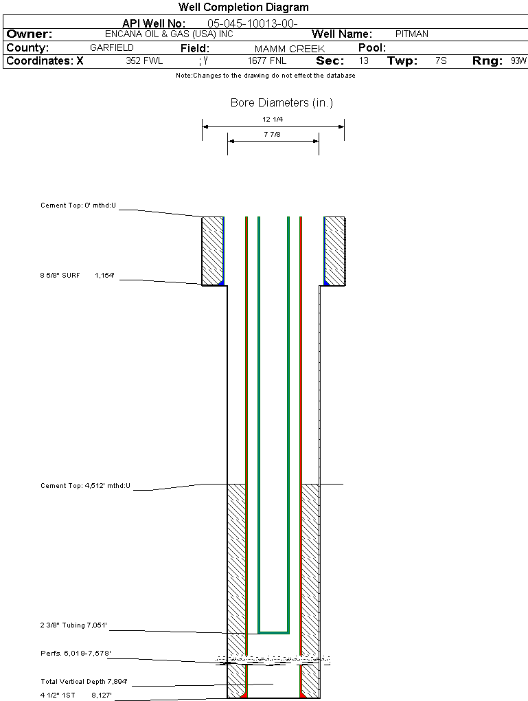 | Wellbore Completed | | Completion Date: | 10/5/2004 | | Spud Date: | 7/22/2004 | Spud Date Is: | ACTUAL | | Measured TD: | 8127 ft. | Measured PB depth: | 7758 ft. | | True Vertical TD: | 7894 ft. | True Vertical PB depth: | 7517 ft. | | Top PZ Location: | Sec:13 Twp: | Footage: 1970 FNL 10 FWL | | Bottom Hole Location: | Sec:13 Twp: | Footage: 1970 FNL 10 FWL | | Log Types: | GR-CBL/TEMP, RES SAT | | Casing: | String Type: SURF, Hole Size: 12.25 in., Size: 8.625 in., Top: 0 ft., Depth: 1154 ft., Weight: 24 , Citings Type: ACTUAL | | Cement: | Sacks: 615, Top: 0 ft., Bottom: 1154 ft., Determination Method: CALC | | Casing: | String Type: 1ST, Hole Size: 7.875 in., Size: 4.5 in., Top: 0 ft., Depth: 8127 ft., Weight: 11.6 , Citings Type: ACTUAL | | Cement: | Sacks: 920, Top: 4512 ft., Bottom: 8127 ft., Determination Method: CBL | | Formation | Interval Top | Log Bottom | Cored | DSTs | | WASATCH | 0 ft. | 4988 ft. | N | N | | WILLIAMS FORK | 4989 ft. | 8127 ft. | N | N |