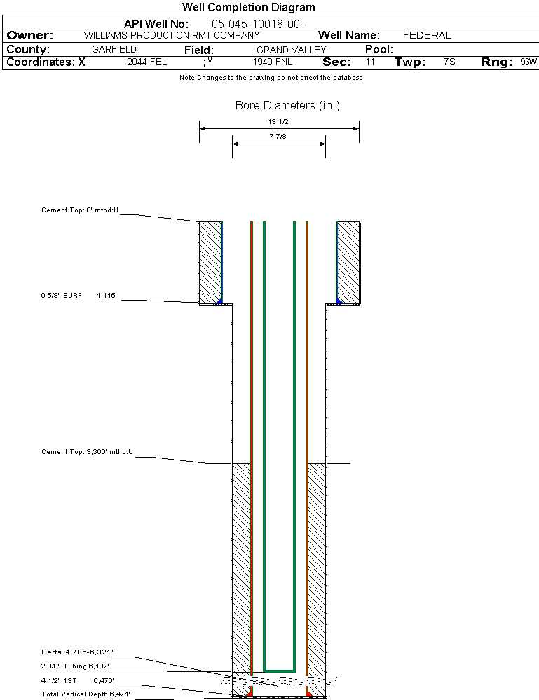 Wellbore #00 Wellbore Classification: GW Status: PR - 9/1/2004 Measured TD: 6473 ft. Vertical TD: 6471 ft.| Wellbore Data for Original Wellbore | Wellbore Classification: GW PR - 9/1/2004 | | Wellbore Permit | DIRECTIONAL | | Permit #: | 20040820 | Expiration Date: | 4/28/2005 | | Proposed Top PZ Location: | Sec: Twp: | Footage: 1989 FNL 1914 FEL | | Bottom Hole Location: | Sec: Twp: | Footage: 1989 FNL 1914 FEL | | Proposed Depth/Form: | 6520 ft. | | Surface Mineral Owner Same: | Yes | | Mineral Owner: | FEDERAL | Surface Owner: | FEDERAL | | Unit: | | Unit Number: | | | Formation And Spacing: | Code: WMFK , Formation: WILLIAMS FORK , Order: 139-40 , Unit Acreage: 320, Drill Unit: N/2 |
