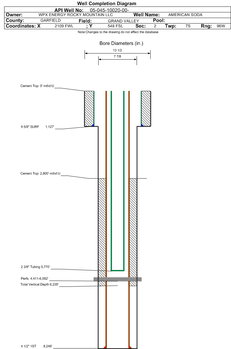 Wellbore #00 Wellbore Classification: GW Status: PR - 2/18/2005 Measured TD: 6256 ft. Vertical TD: 6235 ft.| Wellbore Data for Original Wellbore | Wellbore Classification: GW PR - 2/18/2005 | | Wellbore Permit | DIRECTIONAL | | Permit #: | 20040801 | Expiration Date: | 4/28/2005 | | Proposed Top PZ Location: | Sec: Twp: | Footage: 144 FSL 2127 FWL | | Bottom Hole Location: | Sec: Twp: | Footage: 144 FSL 2127 FWL | | Proposed Depth/Form: | 6290 ft. | | Surface Mineral Owner Same: | No | | Mineral Owner: | FEE | Surface Owner: | FEE | | Unit: | | Unit Number: | | | Formation And Spacing: | Code: WMFK , Formation: WILLIAMS FORK , Order: 139-38 , Unit Acreage: 40, Drill Unit: SESW |