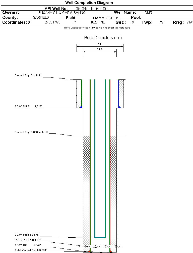 | Wellbore Completed | | Completion Date: | 11/12/2004 | | Spud Date: | 8/18/2004 | Spud Date Is: | ACTUAL | | Measured TD: | 9357 ft. | Measured PB depth: | 9305 ft. | | True Vertical TD: | 9281 ft. | True Vertical PB depth: | | | Top PZ Location: | Sec:9 Twp: | Footage: 330 FNL 1980 FWL | | Bottom Hole Location: | Sec:9 Twp: | Footage: 330 FNL 1980 FWL | | Log Types: | PEX, PEX, CBL/TEMP/GAMMA | | Casing: | String Type: SURF, Hole Size: 11 in., Size: 8.625 in., Top: 0 ft., Depth: 1523 ft., Weight: 24 , Citings Type: ACTUAL | | Cement: | Sacks: 465, Top: 0 ft., Bottom: 1528 ft., Determination Method: CALC | | Casing: | String Type: 1ST, Hole Size: 7.875 in., Size: 4.5 in., Top: 0 ft., Depth: 9352 ft., Weight: 11.6 , Citings Type: ACTUAL | | Cement: | Sacks: 1245, Top: 3050 ft., Bottom: 9357 ft., Determination Method: CBL | | Formation | Interval Top | Log Bottom | Cored | DSTs | | WASATCH | 0 ft. | 6187 ft. | N | N | | WILLIAMS FORK | 6188 ft. | 9239 ft. | N | N | | ROLLINS | 9240 ft. | 9357 ft. | N | N |