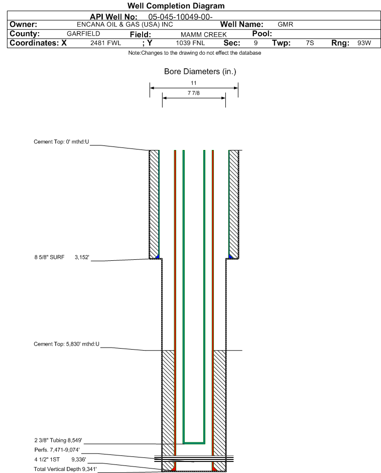 | Wellbore Completed | | Completion Date: | 11/9/2004 | | Spud Date: | 7/31/2004 | Spud Date Is: | ACTUAL | | Measured TD: | 9342 ft. | Measured PB depth: | 30485 ft. | | True Vertical TD: | 9341 ft. | True Vertical PB depth: | 9292 ft. | | Top PZ Location: | Sec:9 Twp: | Footage: 980 FNL 1980 FWL | | Bottom Hole Location: | Sec:9 Twp: | Footage: 980 FNL 1980 FWL | | Log Types: | RES SAT TOOL, PEX, CBL/TEMP/GR | | Casing: | String Type: SURF, Hole Size: 11 in., Size: 8.625 in., Top: 0 ft., Depth: 3152 ft., Weight: 24 , Citings Type: ACTUAL | | Cement: | Sacks: 1025, Top: 0 ft., Bottom: 3156 ft., Determination Method: CALC | | Casing: | String Type: 1ST, Hole Size: 7.875 in., Size: 4.5 in., Top: 0 ft., Depth: 9336 ft., Weight: 11.6 , Citings Type: ACTUAL | | Cement: | Sacks: 775, Top: 5830 ft., Bottom: 9341 ft., Determination Method: CBL | | Formation | Interval Top | Log Bottom | Cored | DSTs | | WASATCH | 0 ft. | 6122 ft. | N | N | | WILLIAMS FORK | 6123 ft. | 9171 ft. | N | N | | ROLLINS | 9172 ft. | 9341 ft. | N | N |