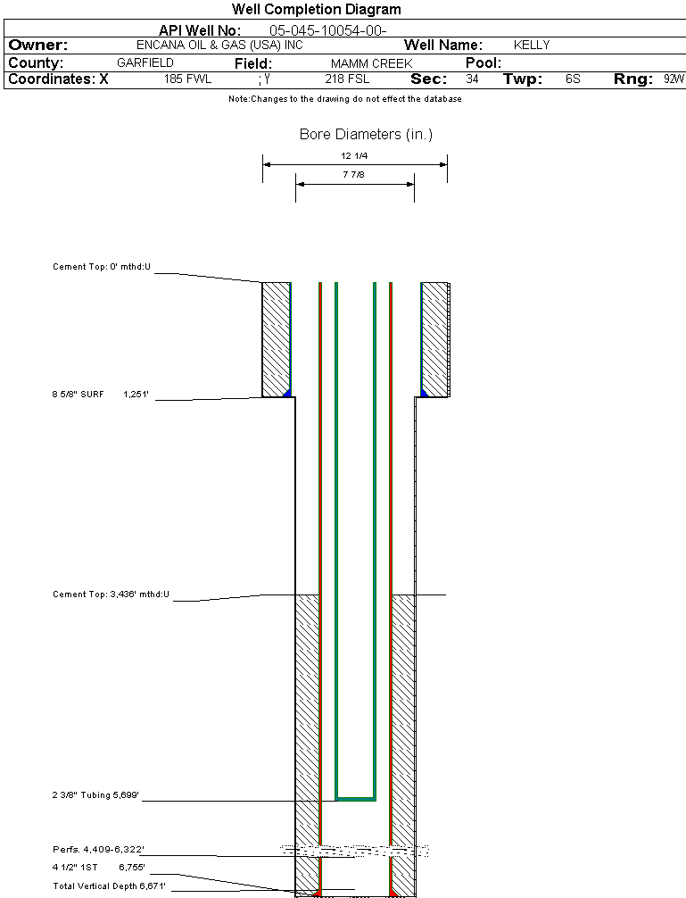 Wellbore #00 Wellbore Classification: GW Status: PR - 10/31/2004 Measured TD: 6755 ft. Vertical TD: 6671 ft.| Wellbore Data for Original Wellbore | Wellbore Classification: GW PR - 10/31/2004 | | Wellbore Permit | DIRECTIONAL | | Permit #: | 20040992 | Expiration Date: | 5/12/2005 | | Proposed Top PZ Location: | Sec: Twp: | Footage: 660 FSL 660 FWL | | Bottom Hole Location: | Sec:34 Twp: | Footage: 660 FSL 660 FWL | | Proposed Depth/Form: | 7200 ft. | | Surface Mineral Owner Same: | No | | Mineral Owner: | FEE | Surface Owner: | FEE | | Unit: | | Unit Number: | | | Formation And Spacing: | Code: CZ-CR , Formation: COZZETTE-CORCORAN , Order: , Unit Acreage: , Drill Unit: | | Formation And Spacing: | Code: RLNS , Formation: ROLLINS , Order: , Unit Acreage: , Drill Unit: | | Formation And Spacing: | Code: WMFK , Formation: WILLIAMS FORK , Order: , Unit Acreage: , Drill Unit: |