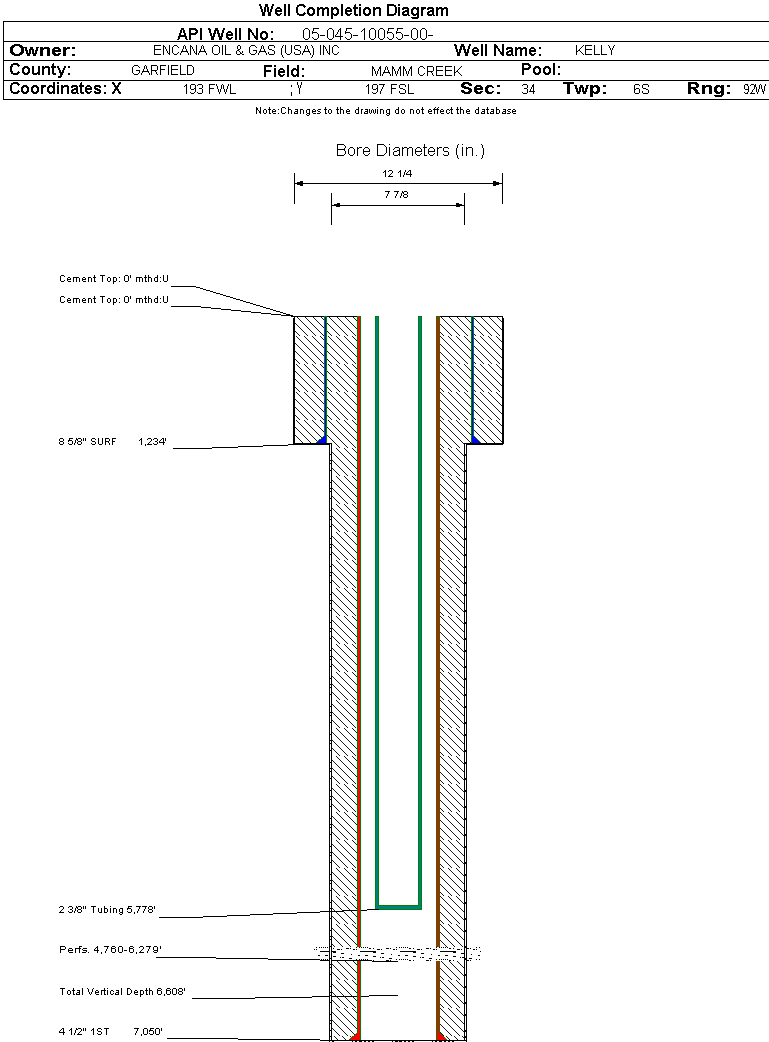 | Wellbore Completed | | Completion Date: | 10/27/2004 | | Spud Date: | 5/24/2004 | Spud Date Is: | ACTUAL | | Measured TD: | 7055 ft. | Measured PB depth: | 6968 ft. | | True Vertical TD: | 6608 ft. | True Vertical PB depth: | 6521 ft. | | Top PZ Location: | Sec: Twp: | Footage: 660 FSL 1980 FWL | | Bottom Hole Location: | Sec:34 Twp: | Footage: 660 FSL 1980 FWL | | Log Types: | | | Casing: | String Type: SURF, Hole Size: 12.25 in., Size: 8.625 in., Top: 0 ft., Depth: 1234 ft., Weight: 24 , Citings Type: ACTUAL | | Cement: | Sacks: 815, Top: 0 ft., Bottom: 1234 ft., Determination Method: CALC | | Casing: | String Type: 1ST, Hole Size: 7.875 in., Size: 4.5 in., Top: 0 ft., Depth: 7050 ft., Weight: 11.6 , Citings Type: ACTUAL | | Cement: | Sacks: 2145, Top: 0 ft., Bottom: 7055 ft., Determination Method: CBL | | Formation | Interval Top | Log Bottom | Cored | DSTs | | WASATCH | 0 ft. | 3608 ft. | N | N | | WILLIAMS FORK | 3609 ft. | 6850 ft. | N | N | | ROLLINS | 6851 ft. | 7055 ft. | N | N |