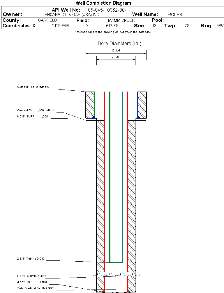 | Wellbore Completed | | Completion Date: | 9/3/2004 | | Spud Date: | 6/22/2004 | Spud Date Is: | ACTUAL | | Measured TD: | 8109 ft. | Measured PB depth: | 7855 ft. | | True Vertical TD: | 7980 ft. | True Vertical PB depth: | | | Top PZ Location: | Sec: Twp: | Footage: 10 FSL 1330 FWL | | Bottom Hole Location: | Sec:13 Twp: | Footage: 10 FFLWL 1330 FWL | | Log Types: | CBL/GR, PEX | | Casing: | String Type: SURF, Hole Size: 12.25 in., Size: 8.625 in., Top: 0 ft., Depth: 1058 ft., Weight: 24 , Citings Type: ACTUAL | | Cement: | Sacks: 545, Top: 0 ft., Bottom: 1058 ft., Determination Method: CALC | | Casing: | String Type: 1ST, Hole Size: 7.875 in., Size: 4.5 in., Top: 0 ft., Depth: 8109 ft., Weight: 11.6 , Citings Type: ACTUAL | | Cement: | Sacks: 1465, Top: 1160 ft., Bottom: 8109 ft., Determination Method: CBL | | Formation | Interval Top | Log Bottom | Cored | DSTs | | WASATCH | 0 ft. | 4786 ft. | N | N | | WILLIAMS FORK | 4787 ft. | 7905 ft. | N | N | | ROLLINS | 7806 ft. | 8109 ft. | N | N |