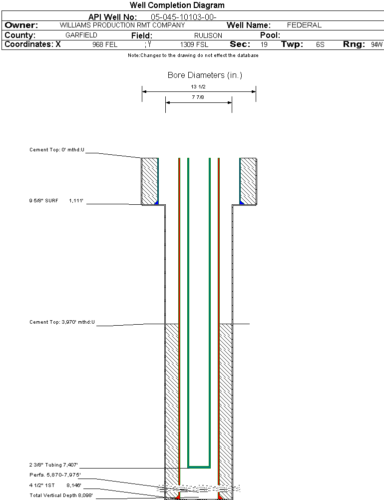 | Wellbore Completed | | Completion Date: | 8/30/2004 | | Spud Date: | 7/14/2004 | Spud Date Is: | ACTUAL | | Measured TD: | 8157 ft. | Measured PB depth: | 8050 ft. | | True Vertical TD: | 8098 ft. | True Vertical PB depth: | | | Top PZ Location: | Sec:19 Twp: 6S 94W | Footage: 869 FSL 468 FEL | | Bottom Hole Location: | Sec:19 Twp: 6S 94W | Footage: 869 FSL 468 FEL | | Log Types: | RESERVOIR MONITOR TOOL ELITE, CBL | | Casing: | String Type: SURF, Hole Size: 13.5 in., Size: 9.625 in., Top: 0 ft., Depth: 1111 ft., Weight: 32.3 , Citings Type: ACTUAL | | Cement: | Sacks: 480, Top: 0 ft., Bottom: 1111 ft., Determination Method: | | Casing: | String Type: 1ST, Hole Size: 7.875 in., Size: 4.5 in., Top: 0 ft., Depth: 8146 ft., Weight: 11.6 , Citings Type: ACTUAL | | Cement: | Sacks: 1000, Top: 3970 ft., Bottom: 8146 ft., Determination Method: CBL | | Formation | Interval Top | Log Bottom | Cored | DSTs | | MESAVERDE | 4613 ft. | | N | N | | CAMEO COAL | 7234 ft. | | N | N | | ROLLINS | 8116 ft. | | N | N |