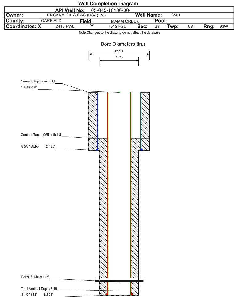 | Wellbore Completed | | Completion Date: | 9/19/2004 | | Spud Date: | 6/25/2004 | Spud Date Is: | ACTUAL | | Measured TD: | 8696 ft. | Measured PB depth: | 8628 ft. | | True Vertical TD: | 8461 ft. | True Vertical PB depth: | 8393 ft. | | Top PZ Location: | Sec: Twp: | Footage: 10 FSL 1970 FWL | | Bottom Hole Location: | Sec: Twp: | Footage: 10 FSL 1970 FWL | | Log Types: | GR-CBL/TEMP,GR-PEX | | Casing: | String Type: SURF, Hole Size: 12.25 in., Size: 8.625 in., Top: 0 ft., Depth: 2485 ft., Weight: 24 , Citings Type: ACTUAL | | Cement: | Sacks: 1090, Top: 0 ft., Bottom: 2485 ft., Determination Method: CBL | | Casing: | String Type: 1ST, Hole Size: 7.875 in., Size: 4.5 in., Top: 0 ft., Depth: 8695 ft., Weight: 11.6 , Citings Type: ACTUAL | | Cement: | Sacks: 1160, Top: 1965 ft., Bottom: 8696 ft., Determination Method: CALC | | Formation | Interval Top | Log Bottom | Cored | DSTs | | WASATCH | 0 ft. | 5558 ft. | N | N | | WILLIAMS FORK | 5559 ft. | 8626 ft. | N | N | | ROLLINS | 8627 ft. | 8696 ft. | N | N |