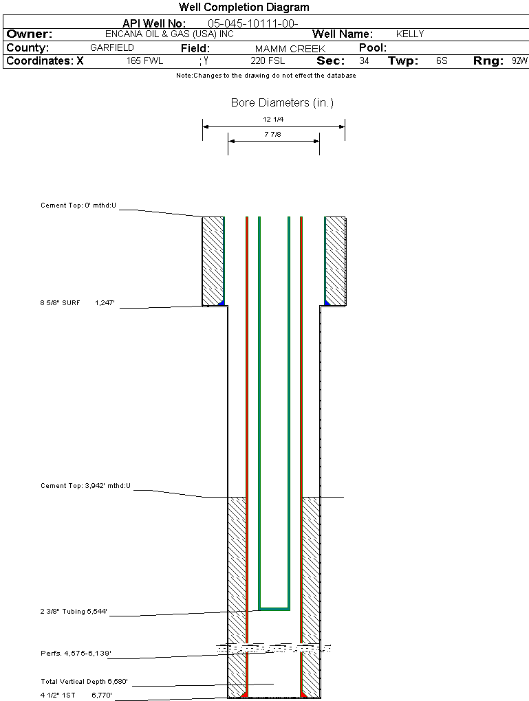 | Wellbore Completed | | Completion Date: | N/A | | Spud Date: | 5/18/2004 | Spud Date Is: | ACTUAL | | Measured TD: | 7120 ft. | Measured PB depth: | 6814 ft. | | True Vertical TD: | 6564 ft. | True Vertical PB depth: | 6258 ft. | | Top PZ Location: | Sec:34 Twp: 6S 92W | Footage: 1320 FSL 650 FWL | | Bottom Hole Location: | Sec:34 Twp: 6S 92W | Footage: 1320 FSL 650 FWL | | Log Types: | GR-PEX, GR-CBL | | Log Types: | | | Casing: | String Type: SURF, Hole Size: 12.25 in., Size: 8.625 in., Top: 0 ft., Depth: 1247 ft., Weight: 24# , Citings Type: ACTUAL | | Cement: | Sacks: 915, Top: 0 ft., Bottom: 1247 ft., Determination Method: VISU | | Casing: | String Type: 1ST, Hole Size: 7.875 in., Size: 4.5 in., Top: 0 ft., Depth: 6770 ft., Weight: 11.6# , Citings Type: ACTUAL | | Cement: | Sacks: 750, Top: 3942 ft., Bottom: 6770 ft., Determination Method: CBL | | Additional Cement: | String Type: 1ST , Top: 3286 ft., Depth: 3320 ft., Bottom: 3974 ft., Sacks: 50, Method: SQUEEZE | | Formation | Interval Top | Log Bottom | Cored | DSTs | | WASATCH | 0 ft. | 3463 ft. | N | N | | WILLIAMS FORK | 3464 ft. | 6650 ft. | N | N | | ROLLINS | 6651 ft. | 6770 ft. | N | N |