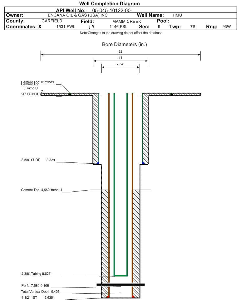 | Wellbore Completed | | Completion Date: | 11/28/2004 | | Spud Date: | 7/21/2004 | Spud Date Is: | ACTUAL | | Measured TD: | 9640 ft. | Measured PB depth: | 9432 ft. | | True Vertical TD: | 9406 ft. | True Vertical PB depth: | | | Top PZ Location: | Sec: Twp: | Footage: 660 FSL 1990 FEL | | Bottom Hole Location: | Sec:9 Twp: | Footage: 660 FSL 1990 FEL | | Log Types: | CBL, GR. CCL, PEX-AIT | | Casing: | String Type: CONDUCTOR, Hole Size: 32 in., Size: 20 in., Top: 0 ft., Depth: 80 ft., Weight: 52.7 , Citings Type: ACTUAL | | Cement: | Sacks: 42, Top: , Bottom: 80 ft., Determination Method: CALC | | Casing: | String Type: SURF, Hole Size: 11 in., Size: 8.625 in., Top: 0 ft., Depth: 3329 ft., Weight: 32 , Citings Type: ACTUAL | | Cement: | Sacks: 965, Top: 0 ft., Bottom: 3330 ft., Determination Method: CALC | | Casing: | String Type: 1ST, Hole Size: 7.625 in., Size: 4.5 in., Top: 0 ft., Depth: 9635 ft., Weight: 11.6 , Citings Type: ACTUAL | | Cement: | Sacks: 1180, Top: 4550 ft., Bottom: 9641 ft., Determination Method: CBL | | Formation | Interval Top | Log Bottom | Cored | DSTs | | WASATCH | 0 ft. | 6523 ft. | N | N | | WILLIAMS FORK | 6524 ft. | 9514 ft. | N | N | | ROLLINS | 9515 ft. | 9640 ft. | N | N |