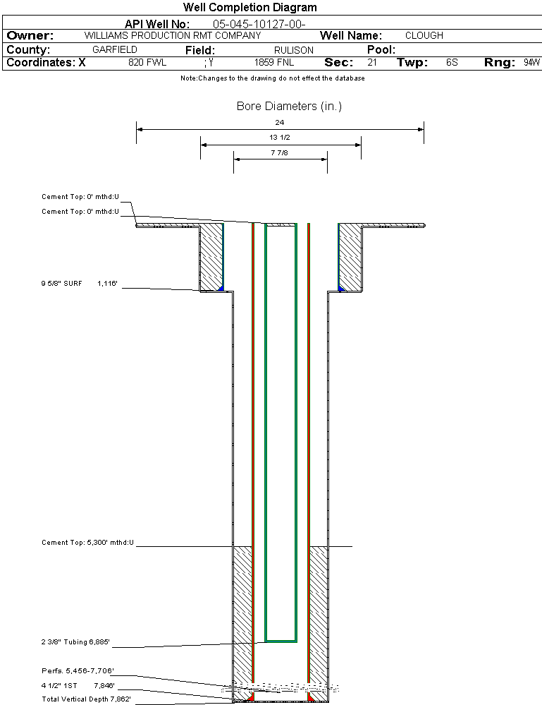 Wellbore #00 Wellbore Classification: GW Status: PR - 3/30/2005 Measured TD: 7870 ft. Vertical TD: 7862 ft.| Wellbore Data for Original Wellbore | Wellbore Classification: GW PR - 3/30/2005 | | Wellbore Permit | DIRECTIONAL | | Permit #: | 20041234 | Expiration Date: | 6/21/2005 | | Proposed Top PZ Location: | Sec: Twp: | Footage: 1772 FNL 581 FWL | | Bottom Hole Location: | Sec: Twp: | Footage: 1772 FNL 581 FWL | | Proposed Depth/Form: | 7953 ft. | | Surface Mineral Owner Same: | Yes | | Mineral Owner: | FEE | Surface Owner: | FEE | | Unit: | | Unit Number: | | | Formation And Spacing: | Code: WMFK , Formation: WILLIAMS FORK , Order: 510-10 , Unit Acreage: 320, Drill Unit: N/2 |