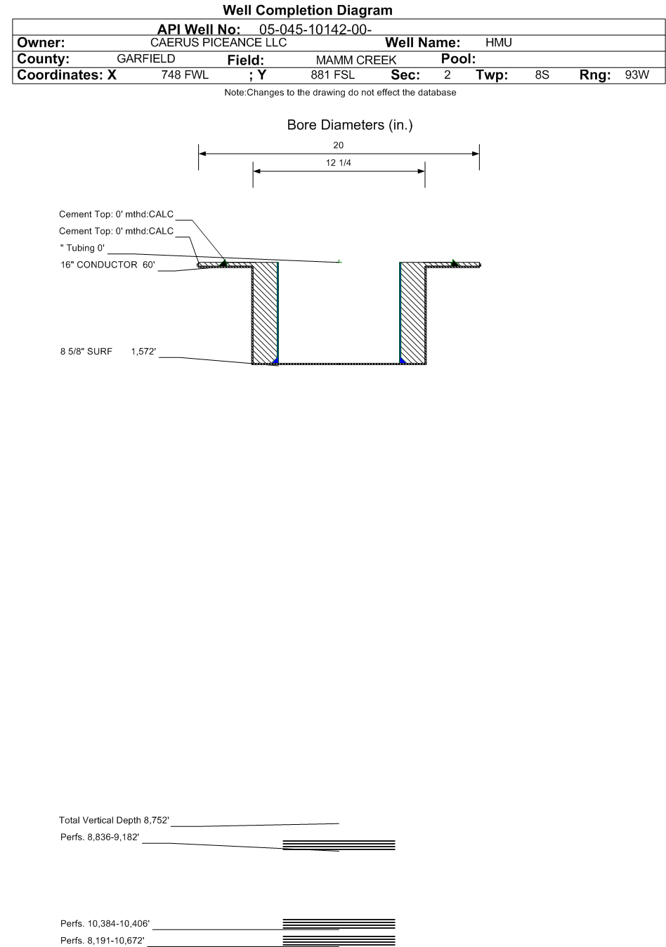 | Wellbore Completed | | Completion Date: | 10/21/2004 | | Spud Date: | 8/31/2004 | Spud Date Is: | ACTUAL | | Measured TD: | 9143 ft. | Measured PB depth: | | | True Vertical TD: | 8752 ft. | True Vertical PB depth: | | | Top PZ Location: | Sec:10 Twp: 8S 93W | Footage: 660 FNL 660 FEL | | Bottom Hole Location: | Sec:10 Twp: 8S 93W | Footage: 660 FNL 660 FEL | | Log Types: | | | Casing: | String Type: CONDUCTOR, Hole Size: 20 in., Size: 16 in., Top: 0 ft., Depth: 60 ft., Weight: 42 , Citings Type: ACTUAL | | Cement: | Sacks: 6, Top: 0 ft., Bottom: 60 ft., Determination Method: CALC | | Casing: | String Type: SURF, Hole Size: 12.25 in., Size: 8.625 in., Top: 0 ft., Depth: 1572 ft., Weight: 32 , Citings Type: ACTUAL | | Cement: | Sacks: 805, Top: 0 ft., Bottom: 1575 ft., Determination Method: CALC | | Formation | Interval Top | Log Bottom | Cored | DSTs | | WASATCH | 0 ft. | 7045 ft. | N | N | | WILLIAMS FORK | 7046 ft. | 9143 ft. | N | N |