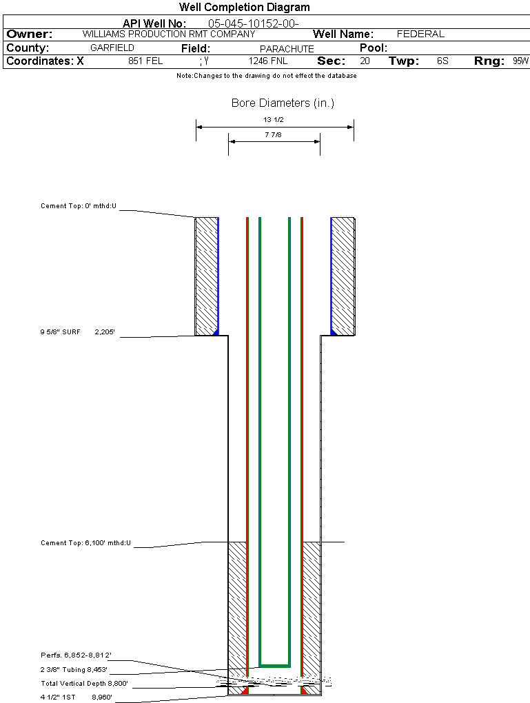 | Wellbore Completed | | Completion Date: | 8/25/2005 | | Spud Date: | 6/27/2005 | Spud Date Is: | ACTUAL | | Measured TD: | 8980 ft. | Measured PB depth: | 8916 ft. | | True Vertical TD: | 8800 ft. | True Vertical PB depth: | | | Top PZ Location: | Sec:20 Twp: 6S 95W | Footage: 1892 FNL 2001 FEL | | Bottom Hole Location: | Sec:20 Twp: 6S 95W | Footage: 1892 FNL 2001 FEL | | Log Types: | | | Casing: | String Type: SURF, Hole Size: 13.5 in., Size: 9.625 in., Top: 0 ft., Depth: 2205 ft., Weight: 323 , Citings Type: ACTUAL | | Cement: | Sacks: 270, Top: 0 ft., Bottom: 2204 ft., Determination Method: | | Casing: | String Type: 1ST, Hole Size: 7.875 in., Size: 4.5 in., Top: 0 ft., Depth: 8960 ft., Weight: 11.6 , Citings Type: ACTUAL | | Cement: | Sacks: 1165, Top: 6100 ft., Bottom: 8960 ft., Determination Method: | | Formation | Interval Top | Log Bottom | Cored | DSTs | | WASATCH | 3253 ft. | | N | N | | FORT UNION | 3615 ft. | | N | N | | MESAVERDE | 5505 ft. | | N | N | | CAMEO | 8204 ft. | | N | N | | ROLLINS | 8884 ft. | | N | N |