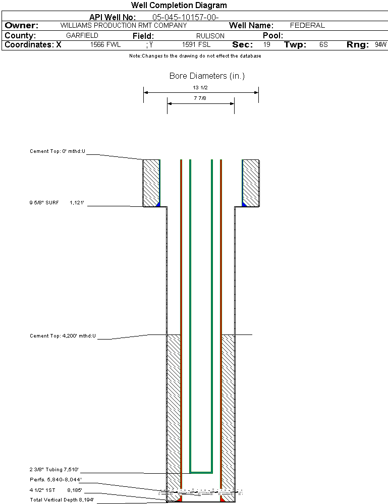 Wellbore #00 Wellbore Classification: GW Status: PR - 12/6/2004 Measured TD: 8195 ft. Vertical TD: 8194 ft.| Wellbore Data for Original Wellbore | Wellbore Classification: GW PR - 12/6/2004 | | Wellbore Permit | DIRECTIONAL | | Permit #: | 20041359 | Expiration Date: | 6/28/2005 | | Proposed Top PZ Location: | Sec: Twp: | Footage: 1602 FSL 1565 FWL | | Bottom Hole Location: | Sec: Twp: | Footage: 1602 FSL 1565 FWL | | Proposed Depth/Form: | 8225 ft. | | Surface Mineral Owner Same: | Yes | | Mineral Owner: | FEDERAL | Surface Owner: | FEDERAL | | Unit: | | Unit Number: | | | Formation And Spacing: | Code: WMFK , Formation: WILLIAMS FORK , Order: 139-40 , Unit Acreage: 320, Drill Unit: S/2 |