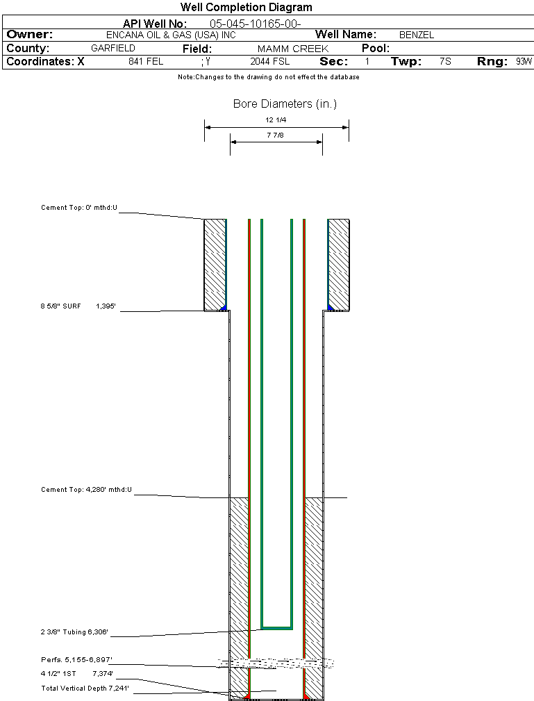 | Wellbore Completed | | Completion Date: | 1/20/2005 | | Spud Date: | 8/29/2004 | Spud Date Is: | ACTUAL | | Measured TD: | 7380 ft. | Measured PB depth: | 7115 ft. | | True Vertical TD: | 7241 ft. | True Vertical PB depth: | | | Top PZ Location: | Sec:6 Twp: | Footage: 1825 FSL 310 FWL | | Bottom Hole Location: | Sec:6 Twp: 7S 92W | Footage: 1825 FSL 310 FWL | | Log Types: | PEX, CBL | | Casing: | String Type: SURF, Hole Size: 12.25 in., Size: 8.625 in., Top: 0 ft., Depth: 1395 ft., Weight: 24 , Citings Type: ACTUAL | | Cement: | Sacks: 720, Top: 0 ft., Bottom: 1395 ft., Determination Method: CALC | | Casing: | String Type: 1ST, Hole Size: 7.875 in., Size: 4.5 in., Top: 0 ft., Depth: 7374 ft., Weight: 11.6 , Citings Type: ACTUAL | | Cement: | Sacks: 1897, Top: 4280 ft., Bottom: 7374 ft., Determination Method: CBL | | Formation | Interval Top | Log Bottom | Cored | DSTs | | WASATCH | 0 ft. | 4136 ft. | N | N | | WILLIAMS FORK | 4137 ft. | 7265 ft. | N | N | | ROLLINS | 7266 ft. | 7380 ft. | N | N |