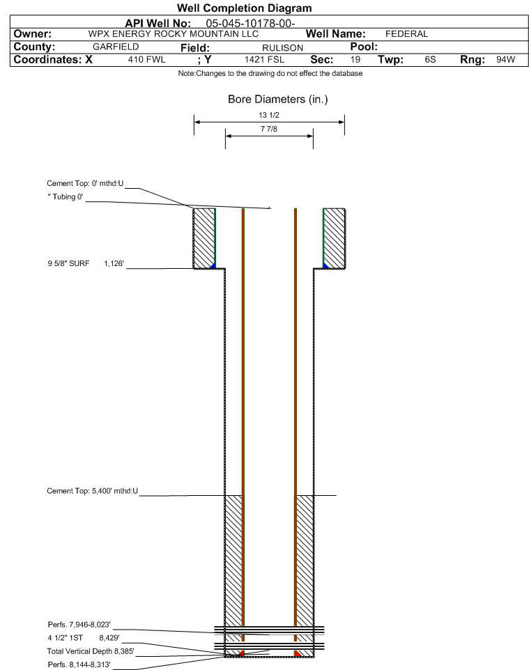 | | Perforation Data: | | Interval Top: | 8144 ft. | # Of Holes: | 14 | | Interval Bottom: | 8313 ft. | Hole Size: | 0.42 in. |