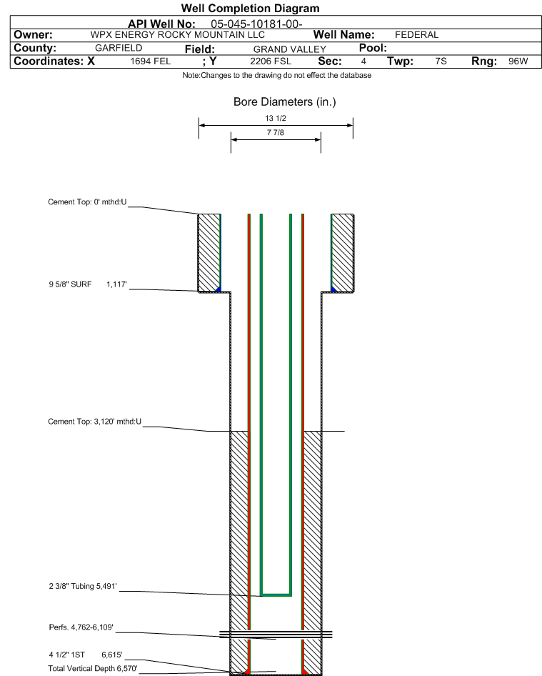 Wellbore #00 Wellbore Classification: GW Status: PR - 5/1/2013 Measured TD: 6622 ft. Vertical TD: 6570 ft.| Wellbore Data for Original Wellbore | Wellbore Classification: GW PR - 5/1/2013 | | Wellbore Permit | DIRECTIONAL | | Permit #: | 20051140 | Expiration Date: | 4/28/2006 | | Proposed Top PZ Location: | Sec: Twp: | Footage: 1640 FSL 1783 FEL | | Bottom Hole Location: | Sec: Twp: | Footage: 1640 FSL 1783 FEL | | Proposed Depth/Form: | 6691 ft. | | Surface Mineral Owner Same: | Yes | | Mineral Owner: | FEDERAL | Surface Owner: | FEDERAL | | Unit: | | Unit Number: | | | Formation And Spacing: | Code: WMFK , Formation: WILLIAMS FORK , Order: 139-40 , Unit Acreage: 320, Drill Unit: S2 | | Casing: | String Type: CONDUCTOR, Hole Size: 24 in., Size: 18 in., Top: , Depth: 45 ft., Weight: 32 , Citings Type: PLANNED | | Cement: | Sacks: 25, Top: 0 ft., Bottom: 45 ft. |
