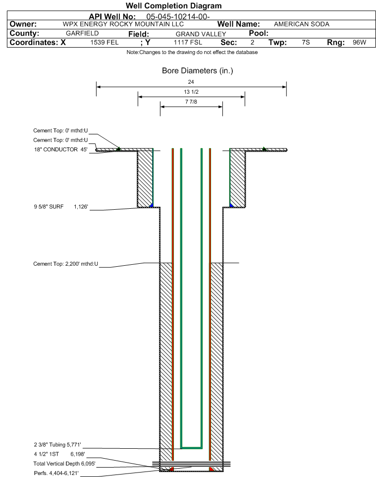 Wellbore #00 Wellbore Classification: GW Status: PR - 2/25/2005 Measured TD: 6236 ft. Vertical TD: 6095 ft.| Wellbore Data for Original Wellbore | Wellbore Classification: GW PR - 2/25/2005 | | Wellbore Permit | DIRECTIONAL | | Permit #: | 20041538 | Expiration Date: | 7/18/2005 | | Proposed Top PZ Location: | Sec: Twp: | Footage: 139 FSL 1716 FEL | | Bottom Hole Location: | Sec: Twp: | Footage: 139 FSL 1716 FEL | | Proposed Depth/Form: | 6235 ft. | | Surface Mineral Owner Same: | No | | Mineral Owner: | FEE | Surface Owner: | FEE | | Unit: | | Unit Number: | | | Formation And Spacing: | Code: WMFK , Formation: WILLIAMS FORK , Order: 510-10 , Unit Acreage: 40, Drill Unit: SWSE |