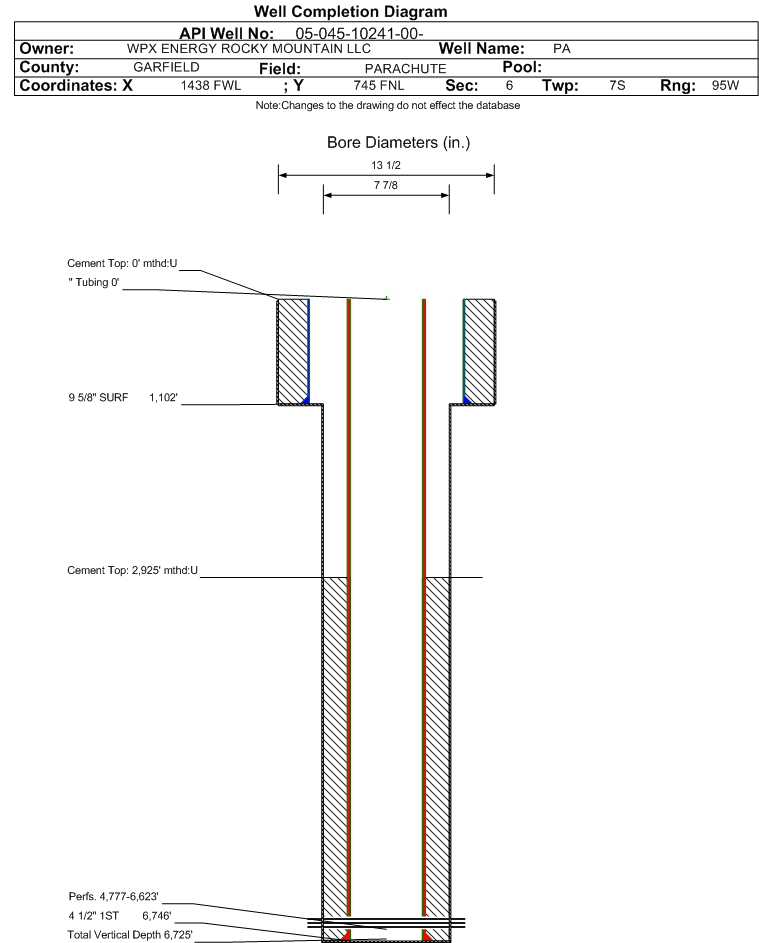 Wellbore #00 Wellbore Classification: GW Status: PA - 3/5/2015 Measured TD: 6748 ft. Vertical TD: 6725 ft.| Wellbore Data for Original Wellbore | Wellbore Classification: GW PA - 3/5/2015 | | Wellbore Permit | DIRECTIONAL | | Permit #: | 20041789 | Expiration Date: | 8/11/2005 | | Proposed Top PZ Location: | Sec: Twp: | Footage: 815 FNL 1830 FWL | | Bottom Hole Location: | Sec: Twp: | Footage: 815 FNL 1830 FWL | | Proposed Depth/Form: | 6877 ft. | | Surface Mineral Owner Same: | Yes | | Mineral Owner: | FEE | Surface Owner: | FEE | | Unit: | | Unit Number: | | | Formation And Spacing: | Code: WMFK , Formation: WILLIAMS FORK , Order: 510-10 , Unit Acreage: 160, Drill Unit: NW/4 |