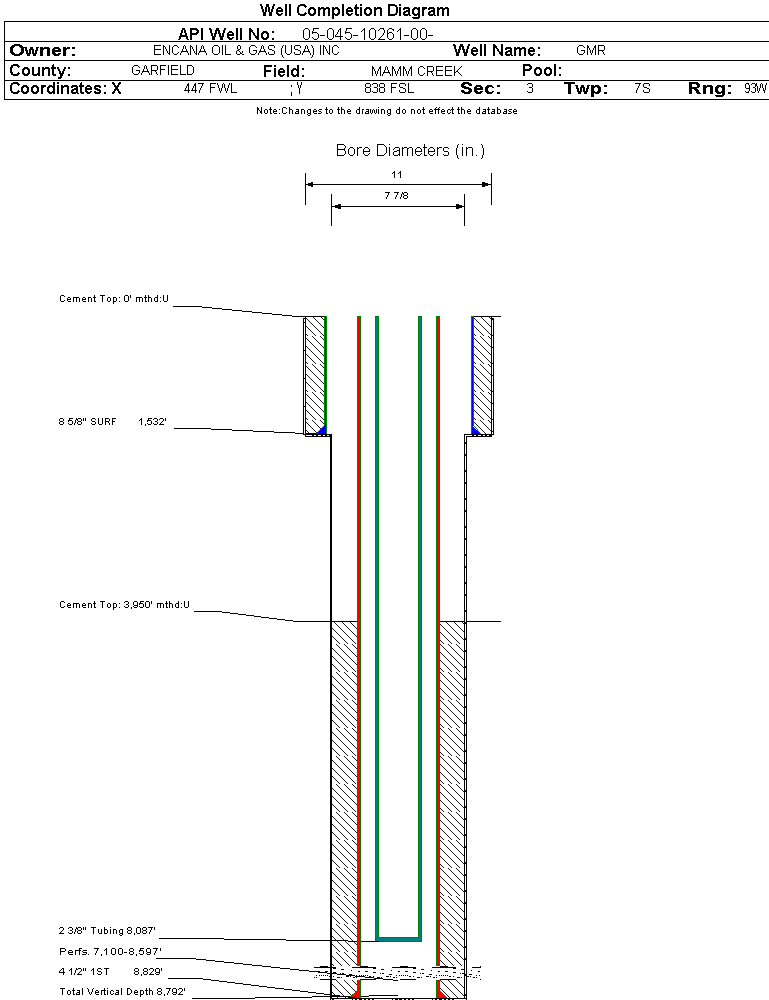 | | Perforation Data: | | Interval Top: | 7100 ft. | # Of Holes: | 66 | | Interval Bottom: | 8597 ft. | Hole Size: | 0.41 in. |