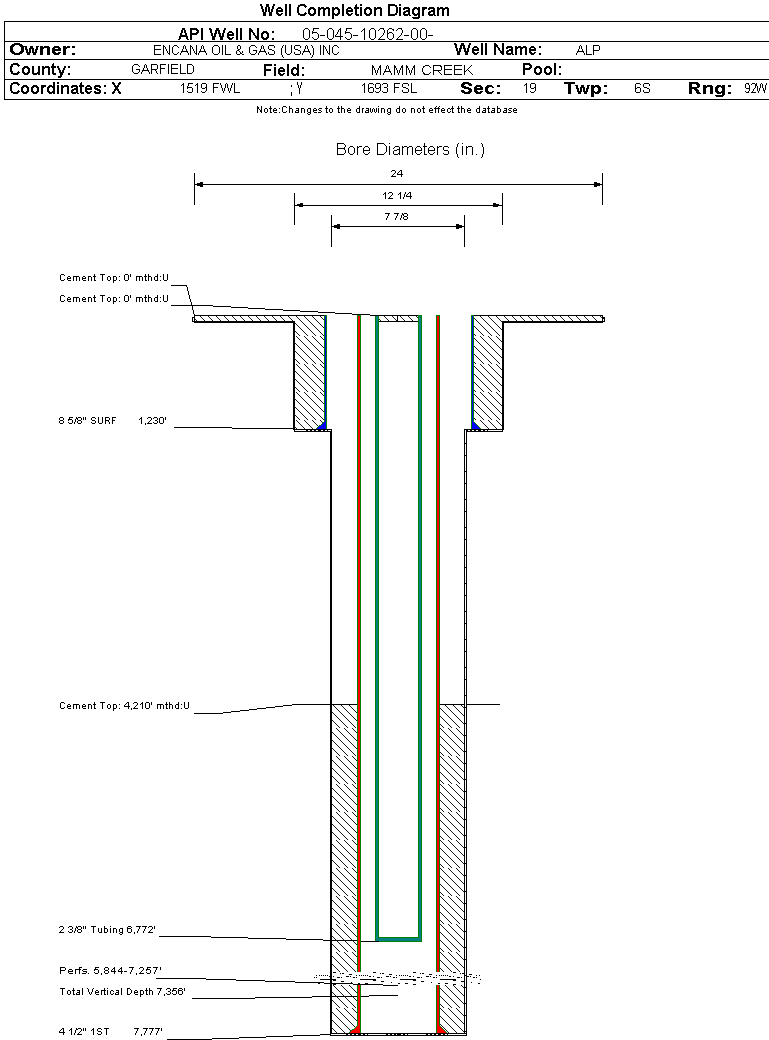 Wellbore #00 Wellbore Classification: GW Status: PR - 12/23/2004 Measured TD: 7777 ft. Vertical TD: 7356 ft.| Wellbore Data for Original Wellbore | Wellbore Classification: GW PR - 12/23/2004 | | Wellbore Permit | DIRECTIONAL | | Permit #: | 20041900 | Expiration Date: | 9/2/2005 | | Proposed Top PZ Location: | Sec: Twp: | Footage: 1980 FSL 660 FEL | | Bottom Hole Location: | Sec: Twp: | Footage: 1980 FSL 660 FEL | | Proposed Depth/Form: | 8900 ft. | | Surface Mineral Owner Same: | No | | Mineral Owner: | FEE | Surface Owner: | FEE | | Unit: | | Unit Number: | | | Formation And Spacing: | Code: ILES , Formation: ILES , Order: , Unit Acreage: , Drill Unit: | | Formation And Spacing: | Code: WMFK , Formation: WILLIAMS FORK , Order: , Unit Acreage: , Drill Unit: |