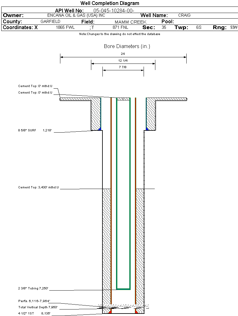 | Wellbore Completed | | Completion Date: | 3/3/2005 | | Spud Date: | 11/20/2004 | Spud Date Is: | ACTUAL | | Measured TD: | 8135 ft. | Measured PB depth: | 8080 ft. | | True Vertical TD: | 7950 ft. | True Vertical PB depth: | | | Top PZ Location: | Sec: Twp: | Footage: 1970 FNL 1320 FWL | | Bottom Hole Location: | Sec: Twp: | Footage: 1970 FNL 1320 FWL | | Log Types: | PEX, CBL, RST | | Casing: | String Type: CONDUCTOR, Hole Size: 24 in., Size: 16 in., Top: 0 ft., Depth: 84 ft., Weight: 42 , Citings Type: ACTUAL | | Cement: | Sacks: 350, Top: 0 ft., Bottom: 84 ft., Determination Method: CALC | | Casing: | String Type: SURF, Hole Size: 12.25 in., Size: 8.625 in., Top: 0 ft., Depth: 1218 ft., Weight: 24 , Citings Type: ACTUAL | | Cement: | Sacks: 850, Top: 0 ft., Bottom: 1218 ft., Determination Method: CALC | | Casing: | String Type: 1ST, Hole Size: 7.875 in., Size: 4.5 in., Top: 0 ft., Depth: 8135 ft., Weight: 11.6 , Citings Type: ACTUAL | | Cement: | Sacks: 1755, Top: 3430 ft., Bottom: 8135 ft., Determination Method: CBL | | Formation | Interval Top | Log Bottom | Cored | DSTs | | WASATCH | 0 ft. | 4674 ft. | N | N | | WILLIAMS FORK | 4675 ft. | 8135 ft. | N | N |