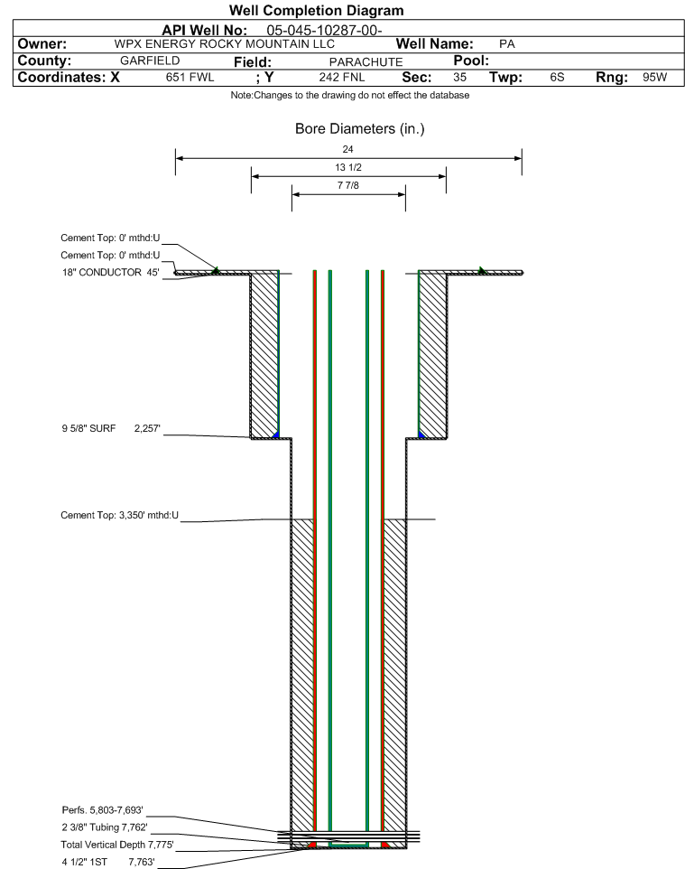 Wellbore #00 Wellbore Classification: GW Status: PR - 9/8/2004 Measured TD: 7780 ft. Vertical TD: 7775 ft.| Wellbore Data for Original Wellbore | Wellbore Classification: GW PR - 9/8/2004 | | Wellbore Permit | DIRECTIONAL | | Permit #: | 20042178 | Expiration Date: | 9/28/2005 | | Proposed Top PZ Location: | Sec: Twp: | Footage: 175 FNL 687 FWL | | Bottom Hole Location: | Sec: Twp: | Footage: 175 FNL 687 FWL | | Proposed Depth/Form: | 7910 ft. | | Surface Mineral Owner Same: | Yes | | Mineral Owner: | FEE | Surface Owner: | FEE | | Unit: | | Unit Number: | | | Formation And Spacing: | Code: WMFK , Formation: WILLIAMS FORK , Order: 139-38 , Unit Acreage: 320, Drill Unit: N/2 |
