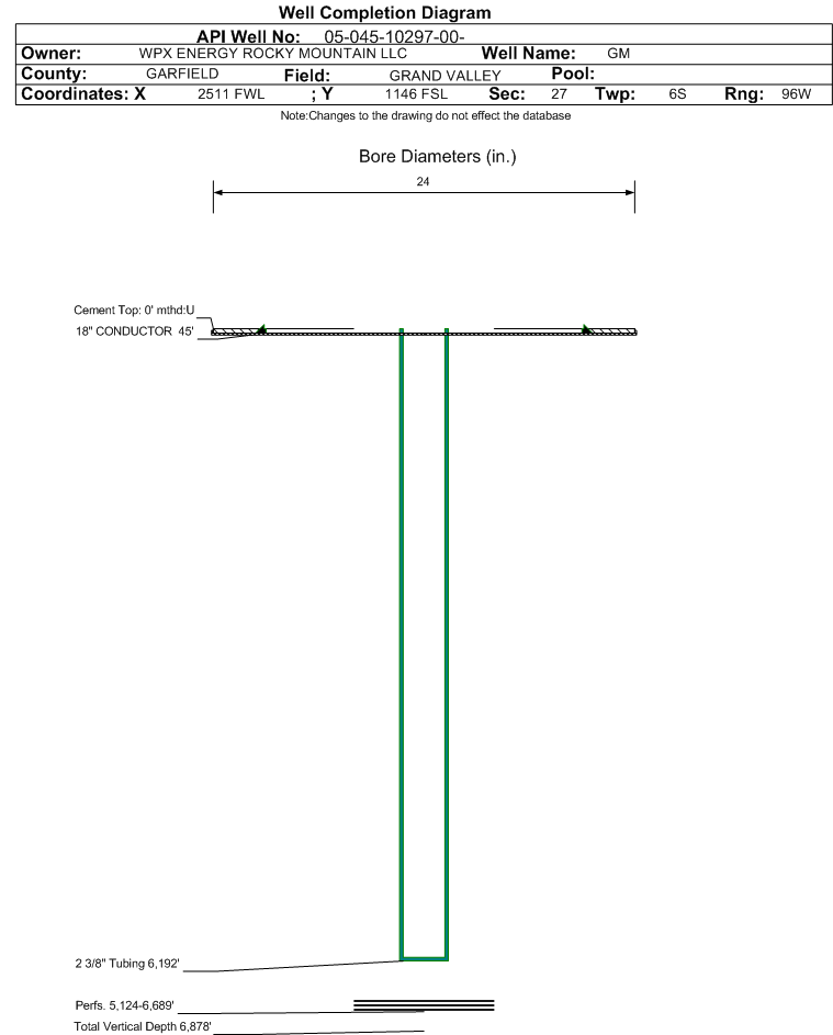 Wellbore #00 Wellbore Classification: GW Status: PR - 12/14/2012 Measured TD: 6936 ft. Vertical TD: 6878 ft.| Wellbore Data for Original Wellbore | Wellbore Classification: GW PR - 12/14/2012 | | Wellbore Permit | DIRECTIONAL | | Permit #: | 20042173 | Expiration Date: | 9/30/2005 | | Proposed Top PZ Location: | Sec: Twp: | Footage: 675 FSL 2050 FWL | | Bottom Hole Location: | Sec: Twp: | Footage: 675 FSL 2050 FWL | | Proposed Depth/Form: | 7023 ft. | | Surface Mineral Owner Same: | Yes | | Mineral Owner: | FEE | Surface Owner: | FEE | | Unit: | | Unit Number: | | | Formation And Spacing: | Code: WMFK , Formation: WILLIAMS FORK , Order: 510-8 , Unit Acreage: 320, Drill Unit: S/2 | | Casing: | String Type: SURF, Hole Size: 13.5 in., Size: 9.625 in., Top: , Depth: 1112 ft., Weight: 32.3 , Citings Type: PLANNED | | Cement: | Sacks: 496, Top: 0 ft., Bottom: 1112 ft. | | Casing: | String Type: 1ST, Hole Size: 7.875 in., Size: 4.5 in., Top: , Depth: 7023 ft., Weight: 11.6 , Citings Type: PLANNED | | Cement: | Sacks: 200, Top: , Bottom: |