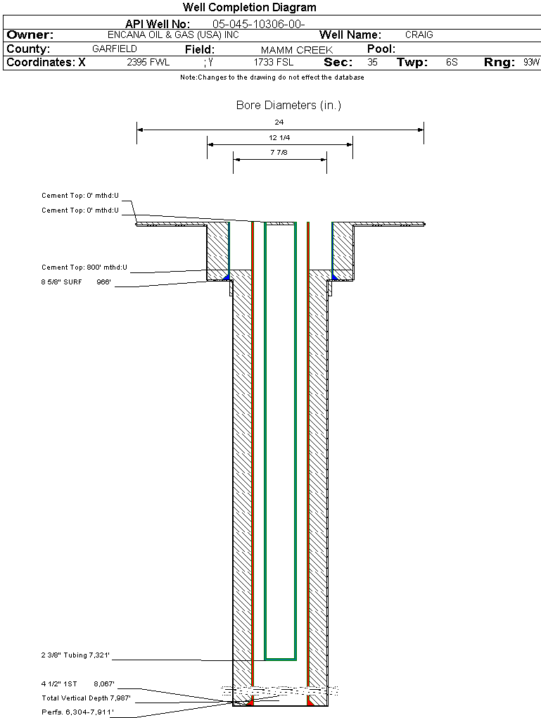 | Wellbore Completed | | Completion Date: | 4/21/2005 | | Spud Date: | 12/27/2004 | Spud Date Is: | ACTUAL | | Measured TD: | 8068 ft. | Measured PB depth: | 8023 ft. | | True Vertical TD: | 7987 ft. | True Vertical PB depth: | 4895 ft. | | Top PZ Location: | Sec: Twp: | Footage: 2440 FFTL 1970 FWL | | Bottom Hole Location: | Sec:35 Twp: | Footage: 2440 FFTL 1970 FWL | | Log Types: | PEX, CBL | | Casing: | String Type: CONDUCTOR, Hole Size: 24 in., Size: 16 in., Top: , Depth: 40 ft., Weight: , Citings Type: ACTUAL | | Cement: | Sacks: , Top: , Bottom: 40 ft., Determination Method: CALC | | Casing: | String Type: SURF, Hole Size: 12.25 in., Size: 8.625 in., Top: 0 ft., Depth: 966 ft., Weight: 24 , Citings Type: ACTUAL | | Cement: | Sacks: 680, Top: 0 ft., Bottom: 1230 ft., Determination Method: CALC | | Casing: | String Type: 1ST, Hole Size: 7.875 in., Size: 4.5 in., Top: 0 ft., Depth: 8067 ft., Weight: 11.6 , Citings Type: ACTUAL | | Cement: | Sacks: 1365, Top: 800 ft., Bottom: 8068 ft., Determination Method: CALC | | Formation | Interval Top | Log Bottom | Cored | DSTs | | WASATCH | 0 ft. | 4798 ft. | N | N | | WILLIAMS FORK | 4799 ft. | 7987 ft. | N | N | | ROLLINS | 7988 ft. | 8068 ft. | N | N |