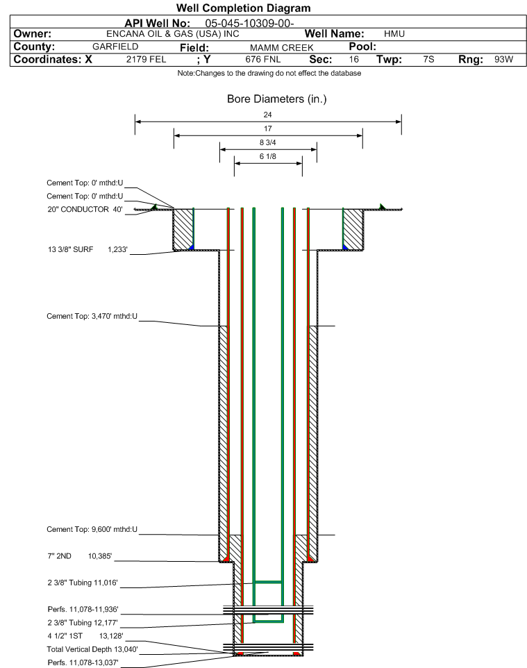 | Wellbore Completed | | Completion Date: | 9/22/2008 | | Spud Date: | 8/6/2005 | Spud Date Is: | ACTUAL | | Measured TD: | 13138 ft. | Measured PB depth: | 11448 ft. | | True Vertical TD: | 13040 ft. | True Vertical PB depth: | 11350 ft. | | Top PZ Location: | Sec:16 Twp: 7S 93W | Footage: 659 FNL 2194 FEL | | Bottom Hole Location: | Sec:16 Twp: 7S 93W | Footage: 1450 FNL 2590 FEL | | Log Types: | RST, PEX, CBL | | Log Types: | | | Casing: | String Type: CONDUCTOR, Hole Size: 24 in., Size: 20 in., Top: 0 ft., Depth: 40 ft., Weight: , Citings Type: ACTUAL | | Cement: | Sacks: 4, Top: 0 ft., Bottom: 40 ft., Determination Method: CALC | | Casing: | String Type: SURF, Hole Size: 17 in., Size: 13.375 in., Top: 0 ft., Depth: 1233 ft., Weight: , Citings Type: ACTUAL | | Cement: | Sacks: 1452, Top: 0 ft., Bottom: 1240 ft., Determination Method: CALC | | Casing: | String Type: 1ST, Hole Size: 6.125 in., Size: 4.5 in., Top: 0 ft., Depth: 13128 ft., Weight: , Citings Type: ACTUAL | | Cement: | Sacks: 270, Top: 9600 ft., Bottom: 13133 ft., Determination Method: CBL | | Casing: | String Type: 2ND, Hole Size: 8.75 in., Size: 7 in., Top: 0 ft., Depth: 10385 ft., Weight: , Citings Type: ACTUAL | | Cement: | Sacks: 846, Top: 3470 ft., Bottom: 10385 ft., Determination Method: CBL | | Formation | Interval Top | Log Bottom | Cored | DSTs | | WASATCH | 0 ft. | 6371 ft. | N | N | | WILLIAMS FORK | 6372 ft. | 7512 ft. | N | N | | ROLLINS | 9422 ft. | 9867 ft. | N | N | | COZZETTE | 9868 ft. | 10084 ft. | N | N | | CORCORAN | 10085 ft. | 10398 ft. | N | N | | SEGO | 10399 ft. | 11052 ft. | N | N | | MANCOS A | 11053 ft. | 13138 ft. | N | N |
