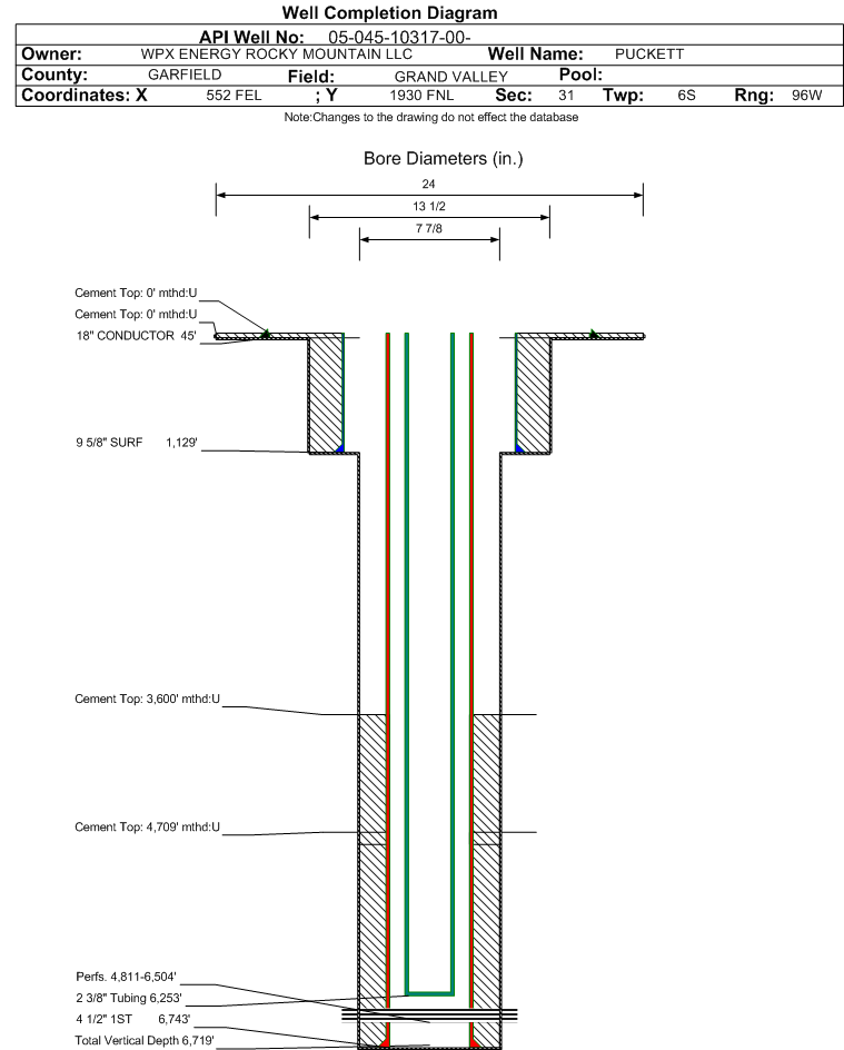 Wellbore #00 Wellbore Classification: GW Status: PR - 3/24/2010 Measured TD: 6759 ft. Vertical TD: 6719 ft.| Wellbore Data for Original Wellbore | Wellbore Classification: GW PR - 3/24/2010 | | Wellbore Permit | DIRECTIONAL | | Permit #: | 20042212 | Expiration Date: | 10/5/2005 | | Proposed Top PZ Location: | Sec:31 Twp: 6S 96W | Footage: 2496 568 | | Bottom Hole Location: | Sec:31 Twp: 6S 96W | Footage: 2496 568 | | Proposed Depth/Form: | 6786 ft. | | Surface Mineral Owner Same: | No | | Mineral Owner: | FEE | Surface Owner: | FEE | | Unit: | | Unit Number: | | | Formation And Spacing: | Code: WMFK , Formation: WILLIAMS FORK , Order: 139-38 , Unit Acreage: 160, Drill Unit: NE |