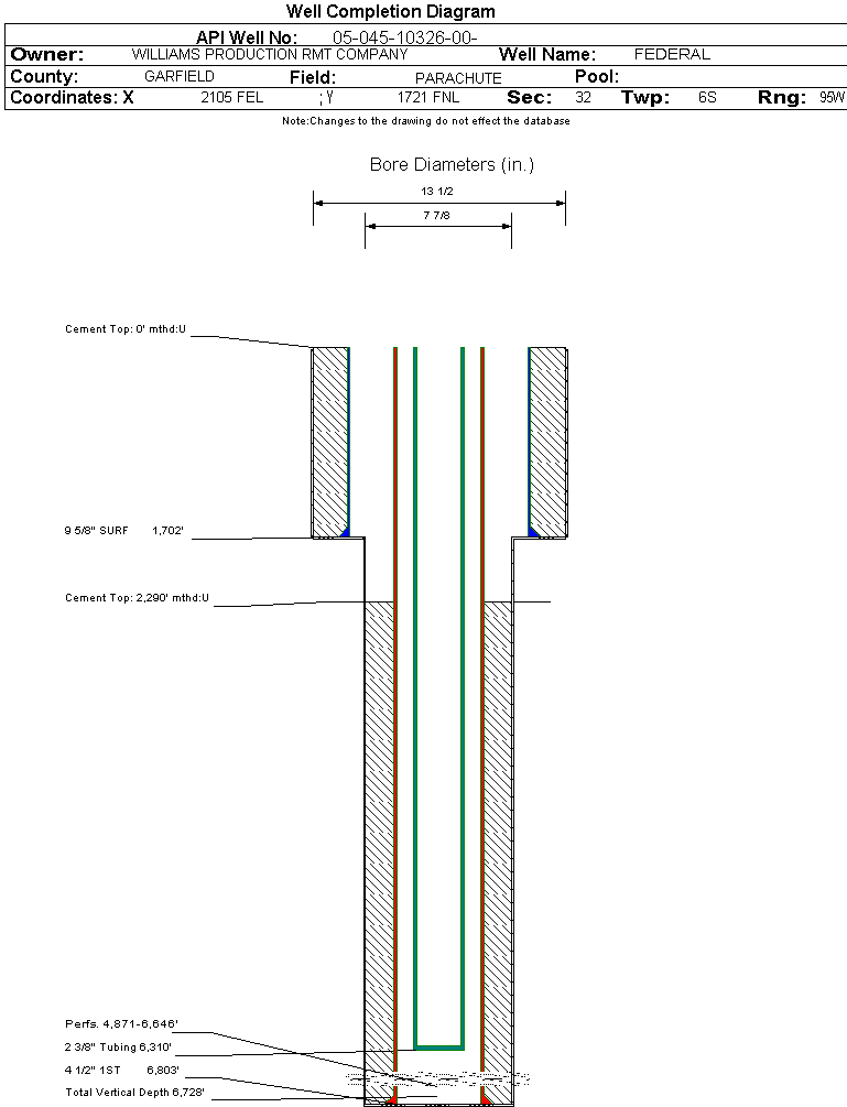 Wellbore #00 Wellbore Classification: GW Status: PR - 10/28/2005 Measured TD: 6805 ft. Vertical TD: 6728 ft.| Wellbore Data for Original Wellbore | Wellbore Classification: GW PR - 10/28/2005 | | Wellbore Permit | DIRECTIONAL | | Permit #: | 20043142 | Expiration Date: | 1/3/2006 | | Proposed Top PZ Location: | Sec: Twp: | Footage: 2463 FNL 1970 FEL | | Bottom Hole Location: | Sec: Twp: | Footage: 2463 FNL 1970 FEL | | Proposed Depth/Form: | 6900 ft. | | Surface Mineral Owner Same: | Yes | | Mineral Owner: | FEDERAL | Surface Owner: | FEDERAL | | Unit: | | Unit Number: | | | Formation And Spacing: | Code: WMFK , Formation: WILLIAMS FORK , Order: 510-9 , Unit Acreage: 160, Drill Unit: NE/4 |