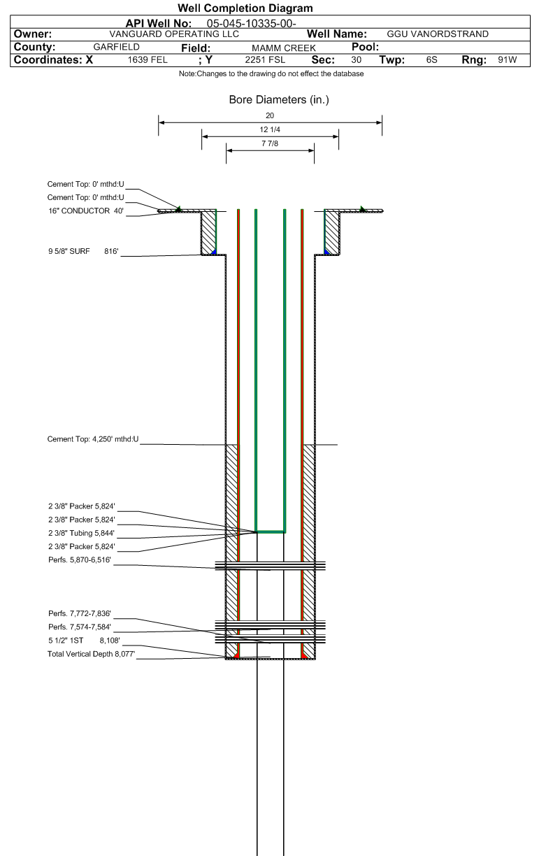 | | Perforation Data: | | Interval Top: | 5870 ft. | # Of Holes: | 64 | | Interval Bottom: | 6516 ft. | Hole Size: | 0.36 in. |