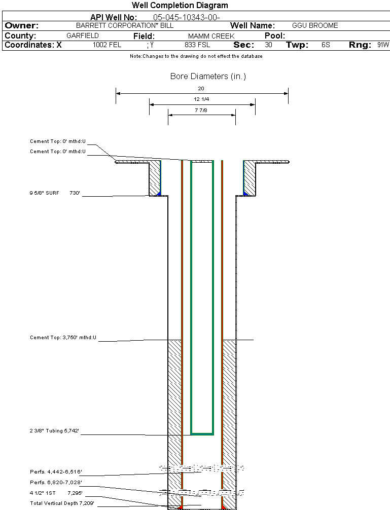 | Wellbore Completed | | Completion Date: | 5/15/2005 | | Spud Date: | 2/4/2005 | Spud Date Is: | ACTUAL | | Measured TD: | 7295 ft. | Measured PB depth: | 7240 ft. | | True Vertical TD: | 7209 ft. | True Vertical PB depth: | 7154 ft. | | Top PZ Location: | Sec:30 Twp: 6S 91W | Footage: 238 FSL 673 FEL | | Bottom Hole Location: | Sec:30 Twp: 6S 91W | Footage: 238 FSL 673 FEL | | Log Types: | HRI/SD/DSN/MICRO LOG | | Casing: | String Type: CONDUCTOR, Hole Size: 20 in., Size: 16 in., Top: 0 ft., Depth: 40 ft., Weight: , Citings Type: ACTUAL | | Cement: | Sacks: , Top: 0 ft., Bottom: 40 ft., Determination Method: | | Casing: | String Type: SURF, Hole Size: 12.25 in., Size: 9.625 in., Top: 0 ft., Depth: 730 ft., Weight: 36 , Citings Type: ACTUAL | | Cement: | Sacks: 2530, Top: 0 ft., Bottom: 730 ft., Determination Method: | | Casing: | String Type: 1ST, Hole Size: 7.875 in., Size: 4.5 in., Top: 0 ft., Depth: 7295 ft., Weight: 11.6 , Citings Type: ACTUAL | | Cement: | Sacks: 1109, Top: 3750 ft., Bottom: 7295 ft., Determination Method: | | Formation | Interval Top | Log Bottom | Cored | DSTs | | WILLIAMS FORK | 3346 ft. | | N | N | | ROLLINS | 6936 ft. | | N | N |