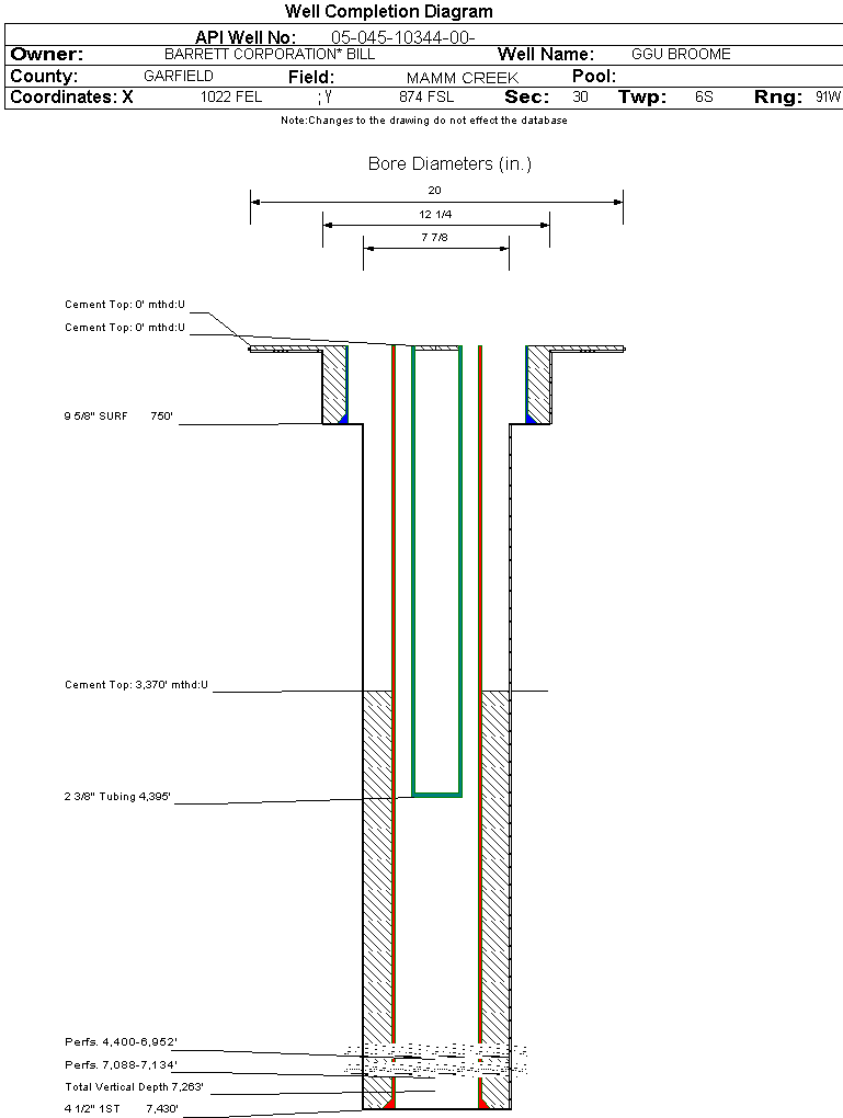 | Wellbore Completed | | Completion Date: | 3/23/2005 | | Spud Date: | 2/4/2005 | Spud Date Is: | ACTUAL | | Measured TD: | 7430 ft. | Measured PB depth: | 7365 ft. | | True Vertical TD: | 7263 ft. | True Vertical PB depth: | 7198 ft. | | Top PZ Location: | Sec:30 Twp: 6S 91W | Footage: 932 FSL 1992 FEL | | Bottom Hole Location: | Sec:30 Twp: 6S 91W | Footage: 932 FSL 1992 FEL | | Log Types: | HRI/SD/DSN/CBL/TEMP LOG | | Casing: | String Type: CONDUCTOR, Hole Size: 20 in., Size: 16 in., Top: 0 ft., Depth: 40 ft., Weight: , Citings Type: ACTUAL | | Cement: | Sacks: , Top: 0 ft., Bottom: 40 ft., Determination Method: | | Casing: | String Type: SURF, Hole Size: 12.25 in., Size: 9.625 in., Top: 0 ft., Depth: 750 ft., Weight: 36 , Citings Type: ACTUAL | | Cement: | Sacks: 230, Top: 0 ft., Bottom: 750 ft., Determination Method: | | Casing: | String Type: 1ST, Hole Size: 7.875 in., Size: 4.5 in., Top: 0 ft., Depth: 7430 ft., Weight: 11.6 , Citings Type: ACTUAL | | Cement: | Sacks: 1200, Top: 3370 ft., Bottom: 7430 ft., Determination Method: | | Formation | Interval Top | Log Bottom | Cored | DSTs | | WILLIAMS FORK - CAMEO | 3460 ft. | | N | N | | ROLLINS | 7088 ft. | | N | N |