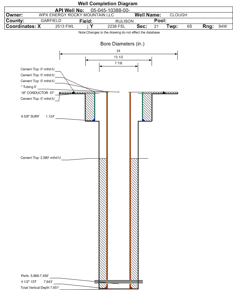 | Wellbore Completed | | Completion Date: | 5/26/2010 | | Spud Date: | 4/5/2005 | Spud Date Is: | ACTUAL | | Measured TD: | 7680 ft. | Measured PB depth: | 7680 ft. | | True Vertical TD: | 7651 ft. | True Vertical PB depth: | 7651 ft. | | Top PZ Location: | Sec:21 Twp: 6S 94W | Footage: 1854 FSL 2523 FWL | | Bottom Hole Location: | Sec:21 Twp: 6S 94W | Footage: 1858 FSL 2502 FWL | | Log Types: | CBL; RESERVOIR MONITOR TOOL ELITE | | Log Types: | CBL; RESERVOIR MONITOR TOOL ELITE | | Casing: | String Type: CONDUCTOR, Hole Size: 24 in., Size: 18 in., Top: 0 ft., Depth: 57 ft., Weight: , Citings Type: ACTUAL | | Cement: | Sacks: 21, Top: 0 ft., Bottom: 57 ft., Determination Method: CALC | | Casing: | String Type: SURF, Hole Size: 13.5 in., Size: 9.625 in., Top: 0 ft., Depth: 1124 ft., Weight: , Citings Type: ACTUAL | | Cement: | Sacks: 375, Top: 0 ft., Bottom: 1124 ft., Determination Method: CALC | | Casing: | String Type: 1ST, Hole Size: 7.875 in., Size: 4.5 in., Top: 0 ft., Depth: 7643 ft., Weight: , Citings Type: ACTUAL | | Cement: | Sacks: 985, Top: 2580 ft., Bottom: 7643 ft., Determination Method: CBL | | Casing: | String Type: S.C. 1.1, Hole Size: , Size: , Top: , Depth: 2100 ft., Weight: , Citings Type: ACTUAL | | Cement: | Sacks: 400, Top: , Bottom: , Determination Method: CALC | | Additional Cement: | String Type: 1ST , Top: , Depth: 2100 ft., Bottom: , Sacks: 400, Method: SQUEEZE | | Formation | Interval Top | Log Bottom | Cored | DSTs | | WASATCH G | 1612 ft. | | N | N | | MESAVERDE | 4080 ft. | | N | N | | CAMEO | 6802 ft. | | N | N | | ROLLINS | 7745 ft. | | N | N |