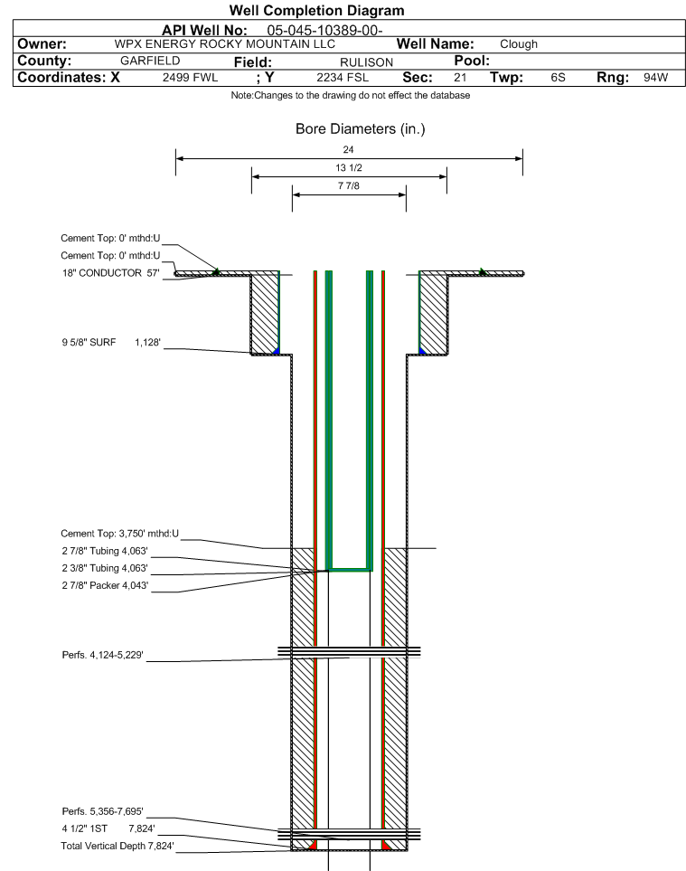 Wellbore #00 Wellbore Classification: DSPW Status: IJ - 9/1/2025 Measured TD: 7880 ft. Vertical TD: 7824 ft.| Wellbore Data for Original Wellbore | Wellbore Classification: DSPW IJ - 9/1/2025 | | Wellbore Permit | DIRECTIONAL | | Permit #: | | Expiration Date: | 3/5/2014 | | Proposed Top PZ Location: | Sec:21 Twp: 6S 94W | Footage: 1752 FSL 1965 FWL | | Bottom Hole Location: | Sec:21 Twp: 6S 94W | Footage: 1750 FSL 1971 FWL | | Proposed Depth/Form: | 7885 ft. | | Surface Mineral Owner Same: | Yes | | Mineral Owner: | FEE | Surface Owner: | FEE | | Unit: | | Unit Number: | | | Formation And Spacing: | Code: WMFK , Formation: WILLIAMS FORK , Order: , Unit Acreage: , Drill Unit: | | Casing: | String Type: CONDUCTOR, Hole Size: 24 in., Size: 18 in., Top: 0 ft., Depth: 45 ft., Weight: 48 , Citings Type: PLANNED | | Cement: | Sacks: 100, Top: 0 ft., Bottom: 45 ft. | | Casing: | String Type: SURF, Hole Size: 13.5 in., Size: 9.625 in., Top: 0 ft., Depth: 1128 ft., Weight: 32.3 , Citings Type: PLANNED | | Cement: | Sacks: 375, Top: 0 ft., Bottom: 1128 ft. | | Casing: | String Type: 1ST, Hole Size: 7.875 in., Size: 4.5 in., Top: 0 ft., Depth: 7824 ft., Weight: 11.6 , Citings Type: PLANNED | | Cement: | Sacks: 1050, Top: 3750 ft., Bottom: 7824 ft. |