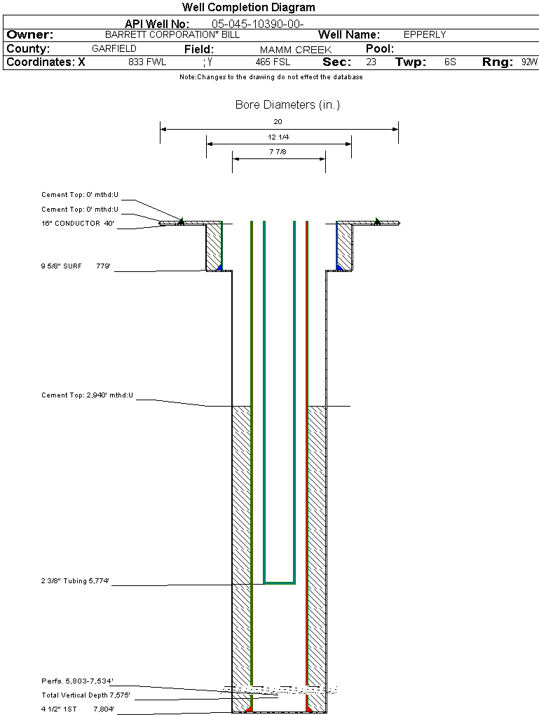 | Wellbore Completed | | Completion Date: | 12/9/2005 | | Spud Date: | 7/1/2005 | Spud Date Is: | ACTUAL | | Measured TD: | 7804 ft. | Measured PB depth: | 7760 ft. | | True Vertical TD: | 7575 ft. | True Vertical PB depth: | 7541 ft. | | Top PZ Location: | Sec:23 Twp: 6S 92W | Footage: 858 FSL 2058 FWL | | Bottom Hole Location: | Sec:23 Twp: 6S 92W | Footage: 858 FSL 2058 FWL | | Log Types: | HALLIBURTON SD/DSN/HRI/MICROLOG AND PRECISION CBL | | Casing: | String Type: CONDUCTOR, Hole Size: 20 in., Size: 16 in., Top: , Depth: 40 ft., Weight: , Citings Type: ACTUAL | | Cement: | Sacks: , Top: 0 ft., Bottom: 40 ft., Determination Method: CALC | | Casing: | String Type: SURF, Hole Size: 12.25 in., Size: 9.625 in., Top: 0 ft., Depth: 779 ft., Weight: , Citings Type: ACTUAL | | Cement: | Sacks: 230, Top: 0 ft., Bottom: 779 ft., Determination Method: CALC | | Casing: | String Type: 1ST, Hole Size: 7.875 in., Size: 4.5 in., Top: 0 ft., Depth: 7804 ft., Weight: , Citings Type: ACTUAL | | Cement: | Sacks: 880, Top: 2940 ft., Bottom: 7804 ft., Determination Method: CBL | | Formation | Interval Top | Log Bottom | Cored | DSTs | | WILLIAMS FORK | 3849 ft. | | N | N | | ROLLINS | 7559 ft. | | N | N |